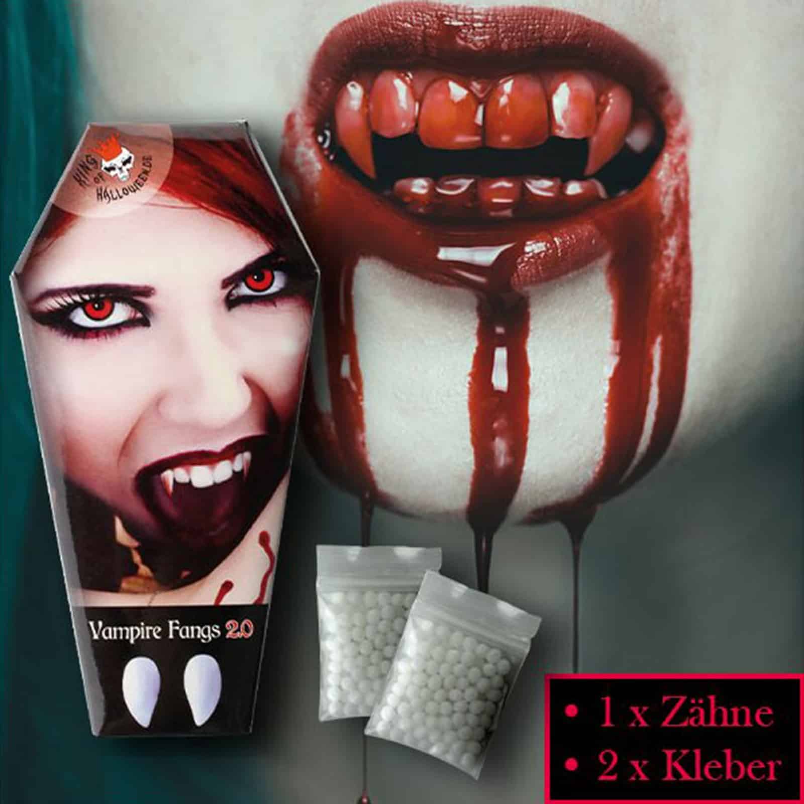 Vampirzähne mit 2 Packungen Thermoplastkügelchen in Sargverpackung mit Anleitung.
