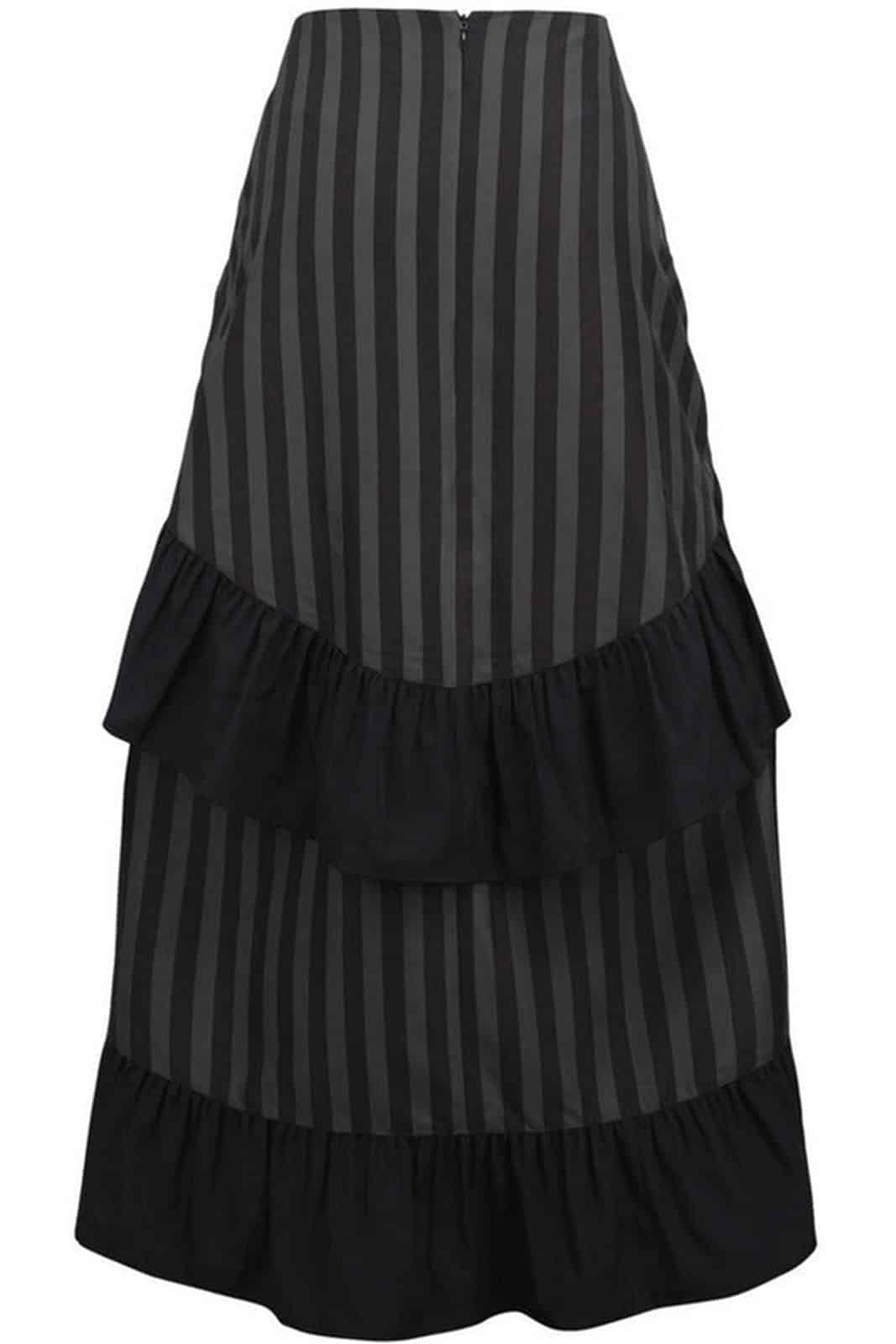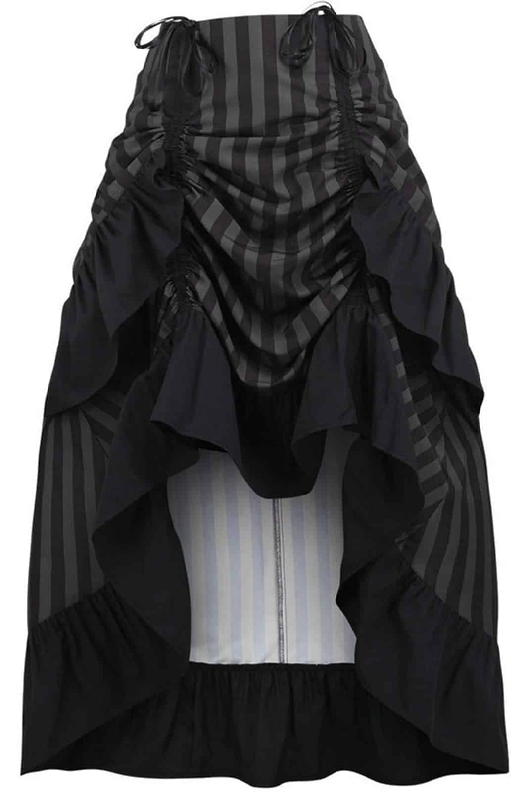 Ein ausdrucksstarker Rock mit variabler Silhouette, der viktorianische Eleganz mit düsterem Piraten- und Steampunk-Flair verbindet. Die gestreifte Optik, fließende Volants und die individuell verstellbare Länge machen ihn zum perfekten Statement-Piece für Bühne, Alltag oder Cosplay.