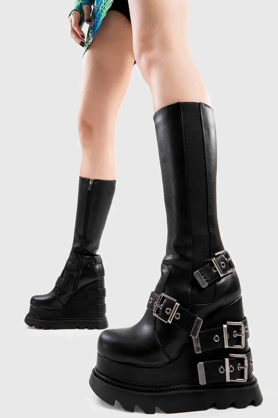 Ausgefallene Gothic-Stiefel mit hoher Keilsohle verziert mit silbernen Schnallen. Mit schwarzem Reißverschluß und runder Zehenpartie.