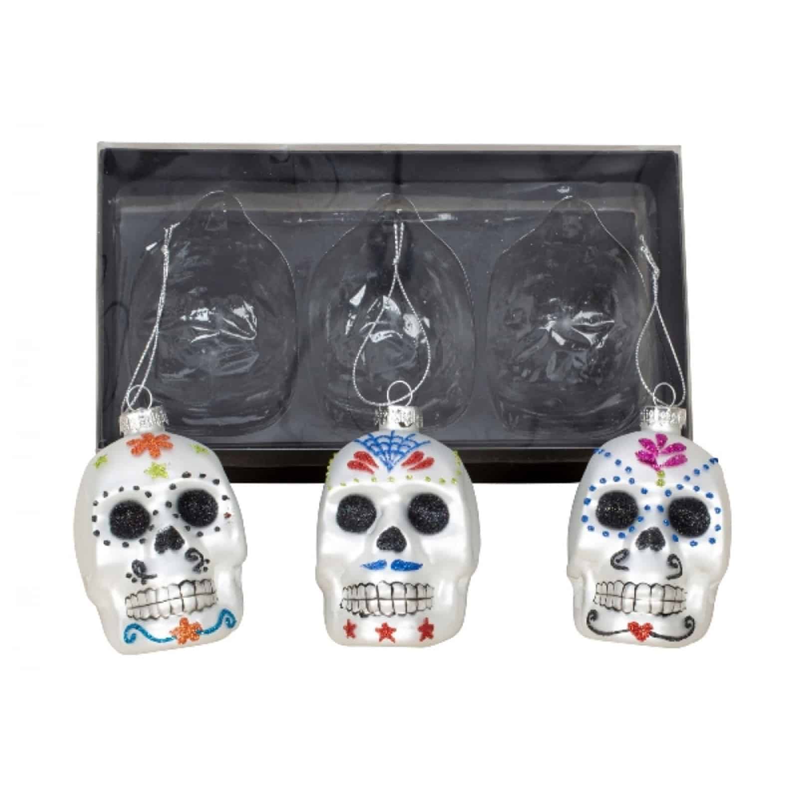 Set mit drei Totenköpfen aus Glas zum Aufhängen.
