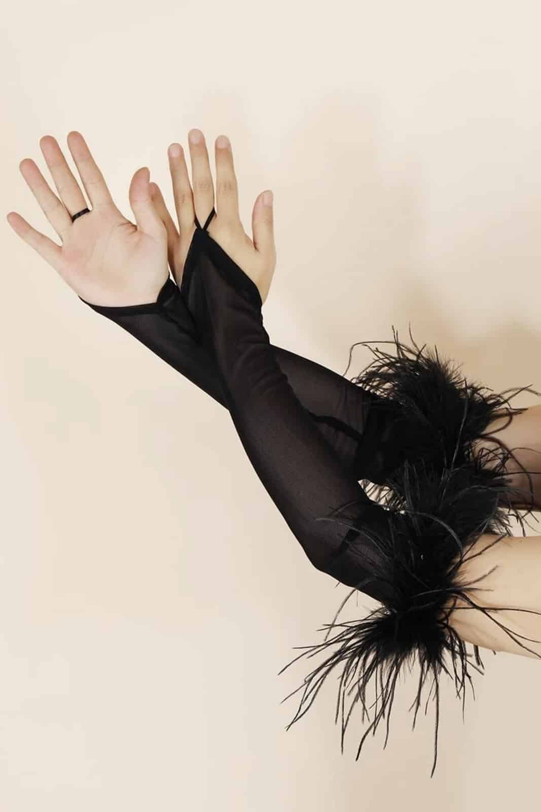 Lange Armstulpen mit Fingerschlaufe und einem Saum aus Federn.