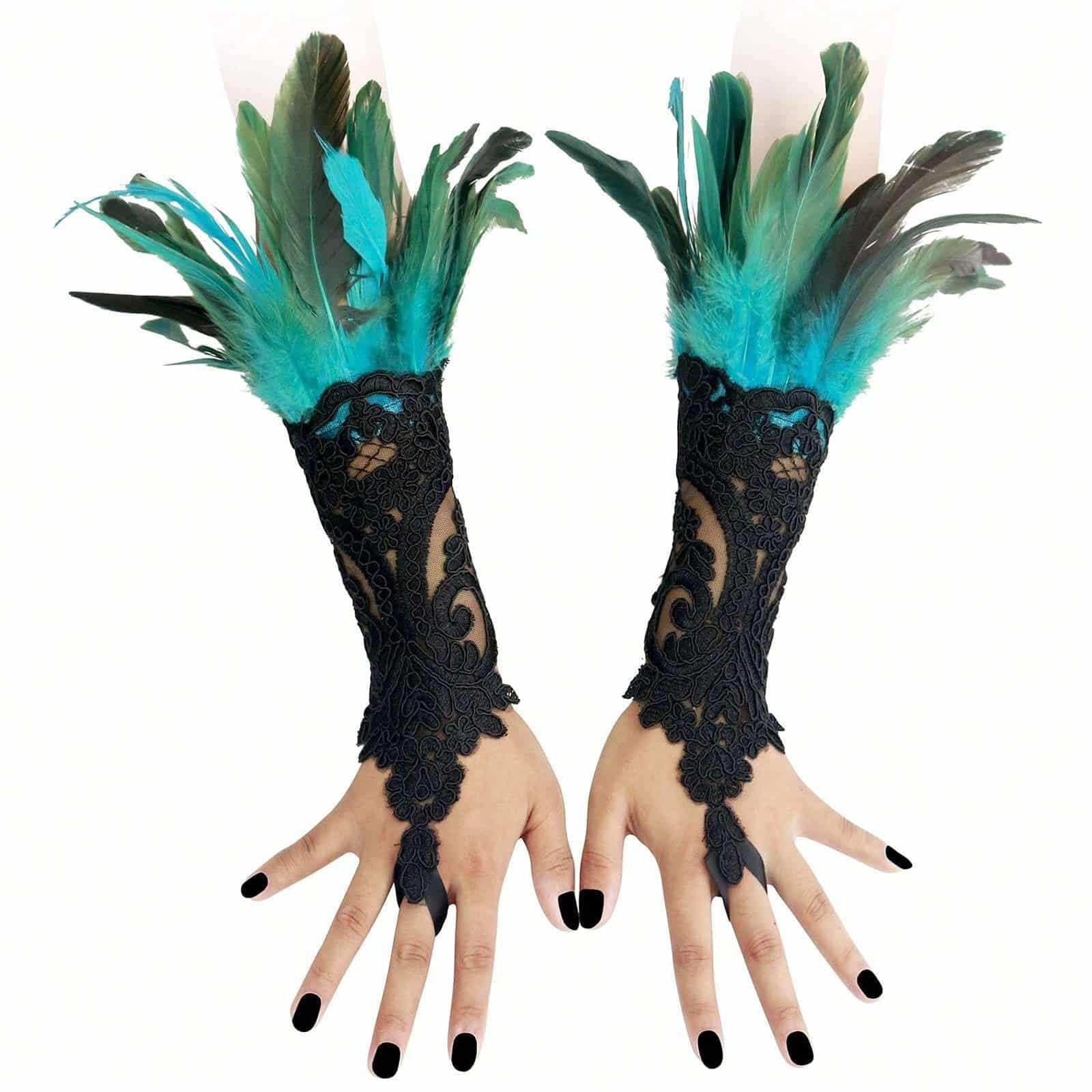 Ein dramatisches Statement aus Spitze und Federn – wie gemacht für dunkle Eleganz und theatralische Auftritte. Feine, florale Spitze umschmeichelt das Handgelenk und den Handrücken, während anmutige blaue Federn sich wie Flügel nach oben auffächern. Sie verleihen jedem Outfit eine geheimnisvolle Aura, inspiriert von Raben, Nacht und viktorianischer Extravaganz.