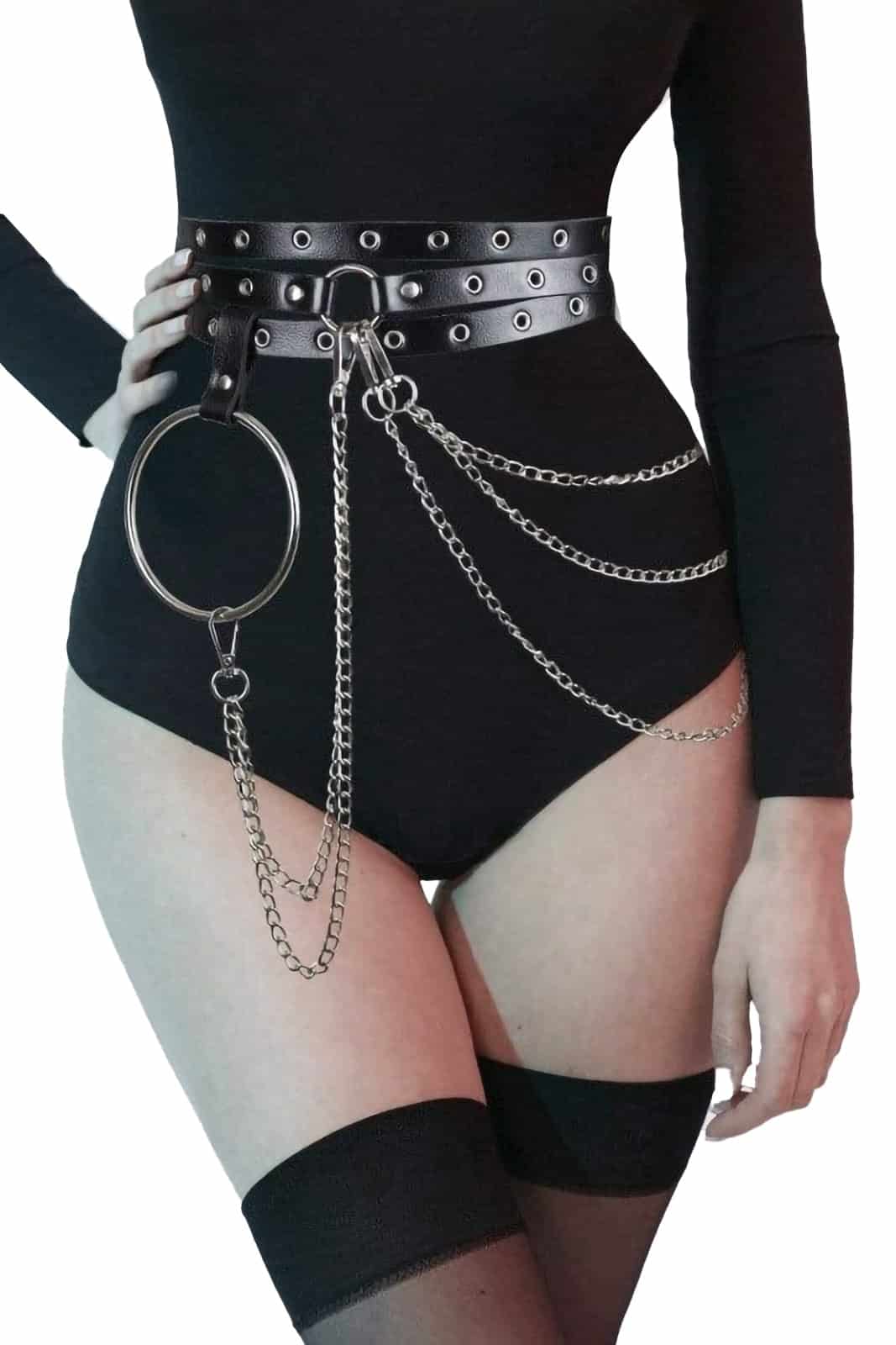 Schöner, schmaler Kunstledergürtel, der mehrmals um die Taille geschlungen werden kann. An der rechten Hüfte mit einem großen und in der Mitte mit einem kleinen O-Ring verzieht, an denen mit Haken abnehmbare Ketten befestigt sind. Einheitsgröße.
