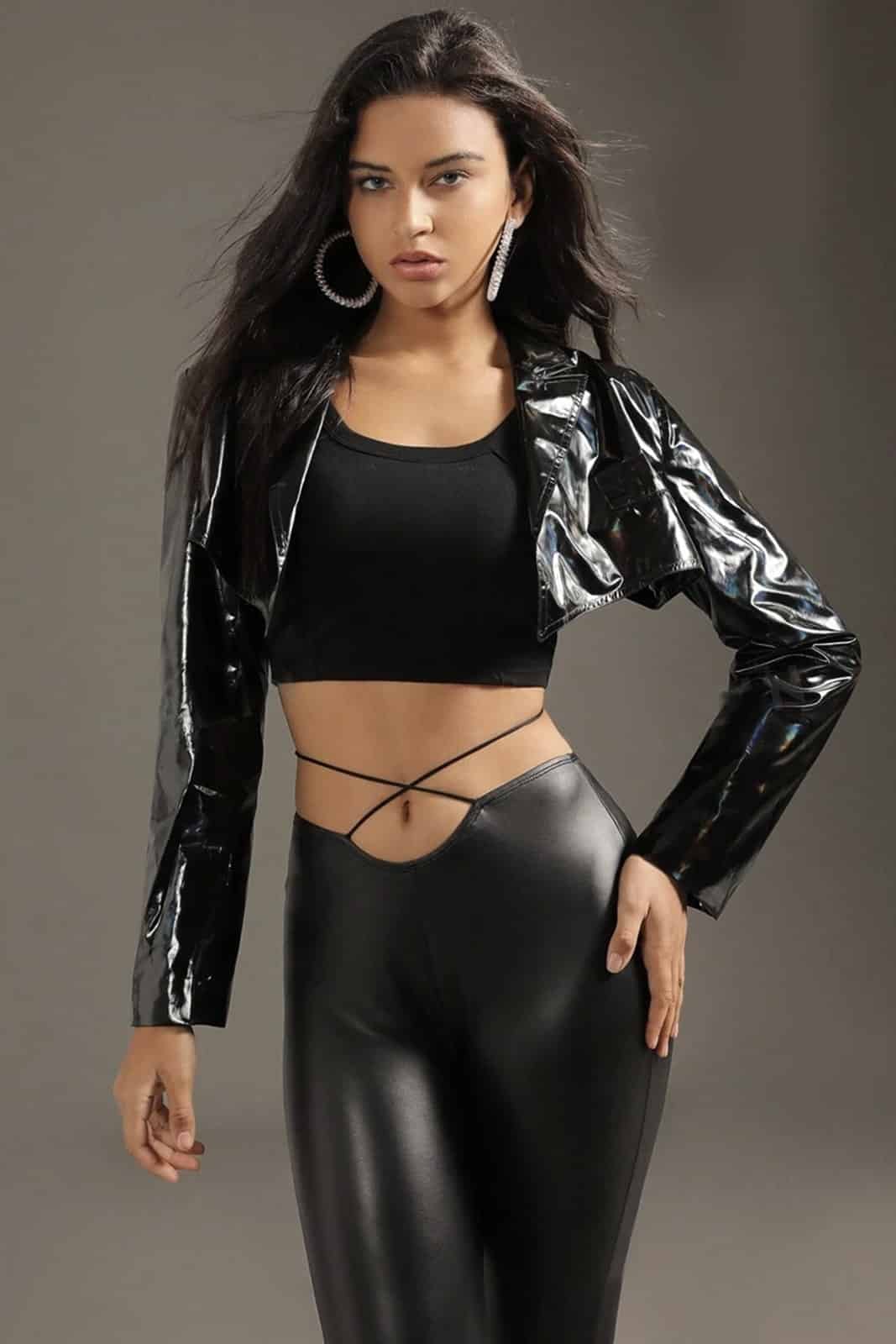 Wie eine glitzernde Perle glänzt der Bolero aus dehnbarem Lackmaterial. Mit langen Ärmeln und klassischem Kragen. Der Bolero wird offen getragen.