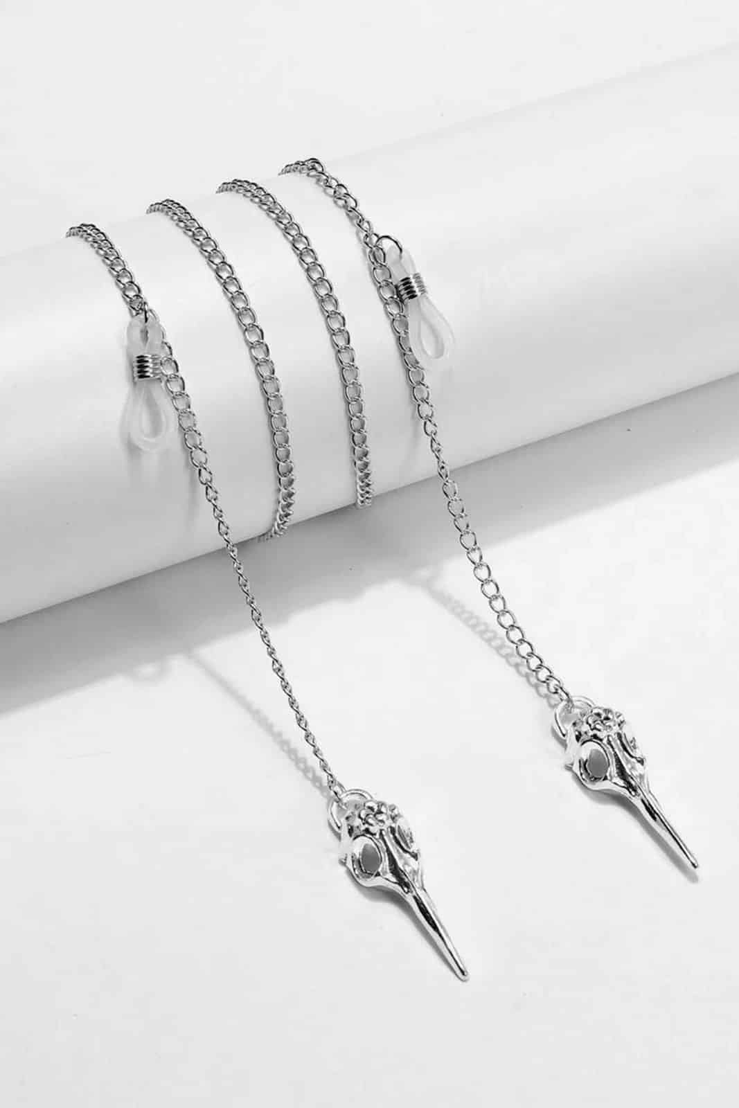 Brillenkette zum Absichern der Brille gegen herunterfallen. Die Kette ist mit einer gummierten Schlaufe versehen. Links und rechts an den Bügeln finden sich zwei kleine Zierketten mit angehängten Rabenschädeln.