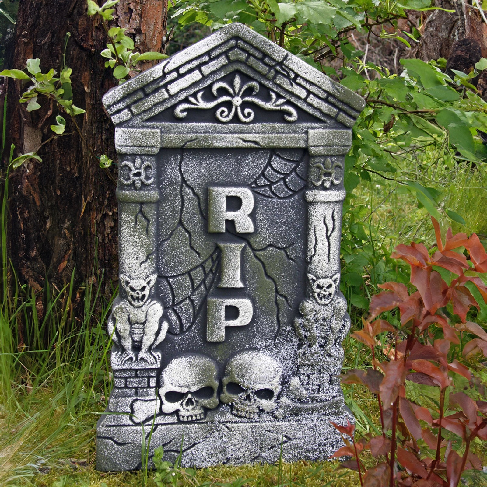 Großer Grabstein mit Aufschrift RIP. Verziert mit Totenköpfen und Dämonen.