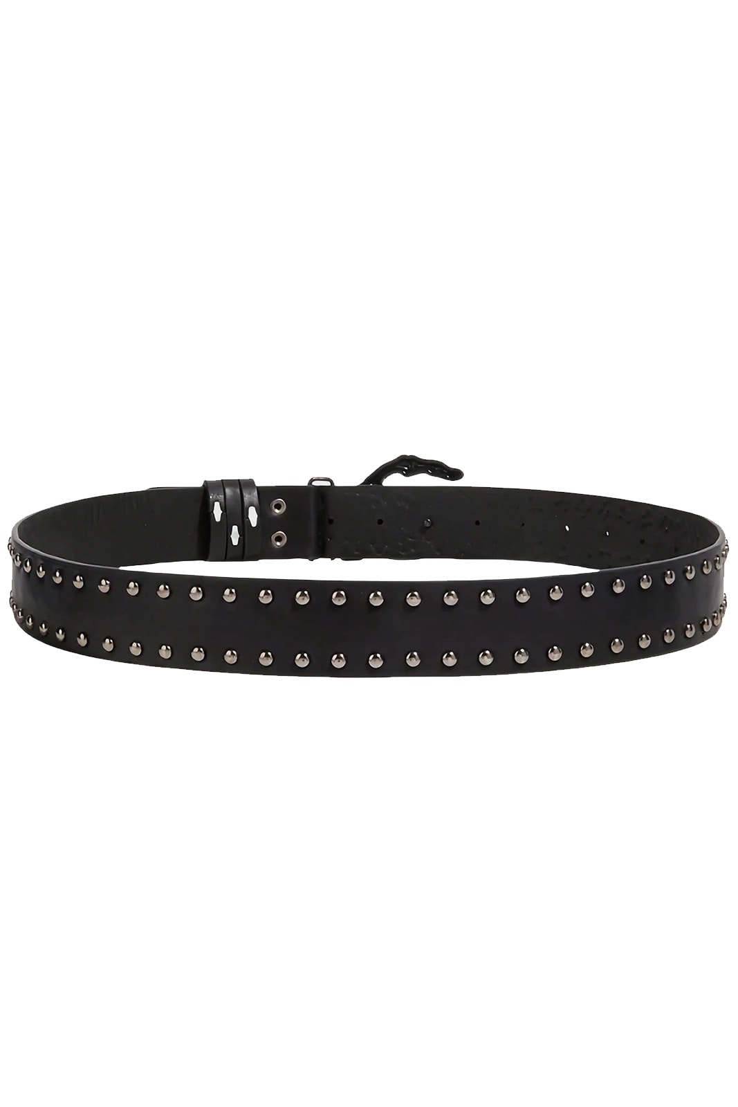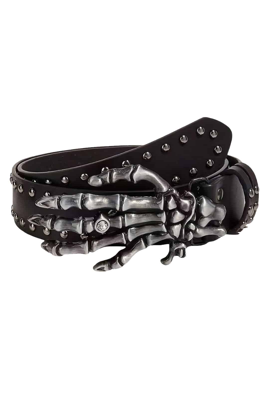 Ein Gürtel mit düsterem Statement-Charakter: Der schwarze Nieten-Gürtel wird von einer markanten Metallschnalle in Form einer skelettierten Hand dominiert, die mit einem funkelnden Kristalldetail verziert ist. Er vereint Gothic-Ästhetik mit rebellischem Stil und wird so zum auffälligen Accessoire für Jeans, Shorts oder alternative Outfits.