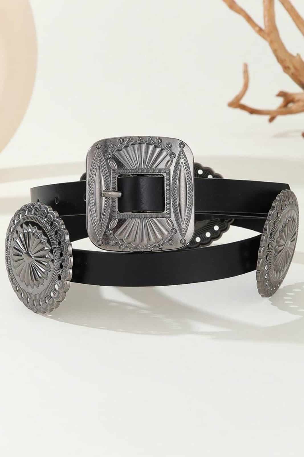 Gothic-Gürtel aus hochwertigem Kunstleder im Western-Style mit großer Frontschnalle und vier fest angebrachten silbernen Emblems.