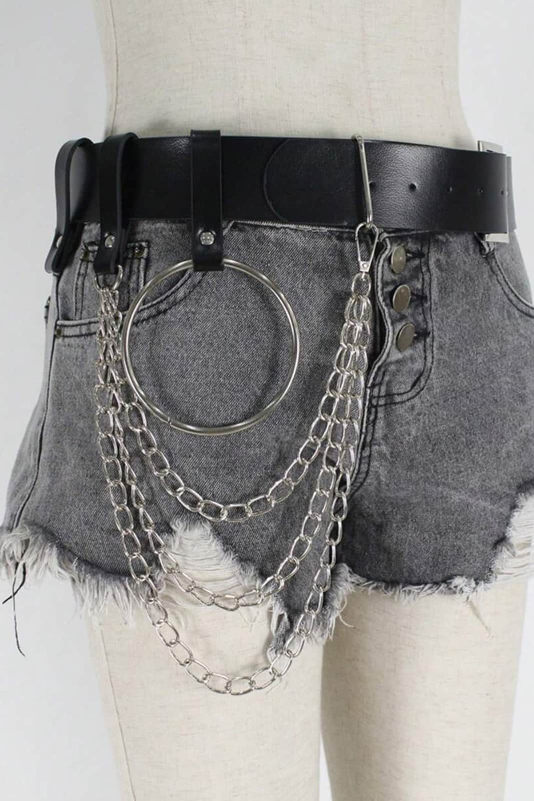 Kunstledergürtel mit einer Breite von ca. 3 cm. Der Gürtel ist mit Laschen besetzt die frei platziert werden können. An den Laschen ist ein großer O-Ring angebracht. Zusätzlich kann eine Kette eingehängt werden und frei platziert werden.
