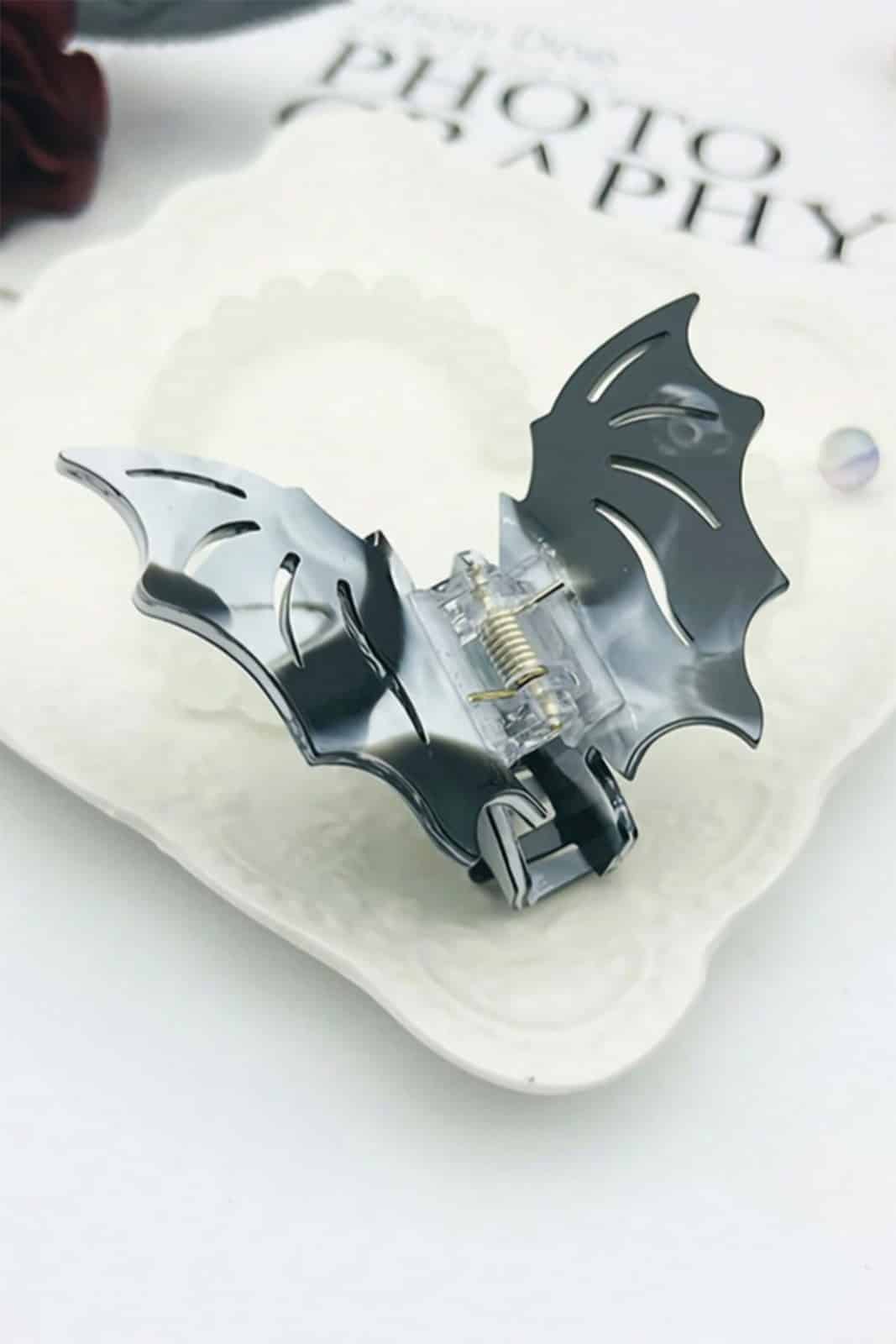 Einzelne schwarz-weisse Haarklammer in Form von Fledermausflügeln aus Kunststoff.