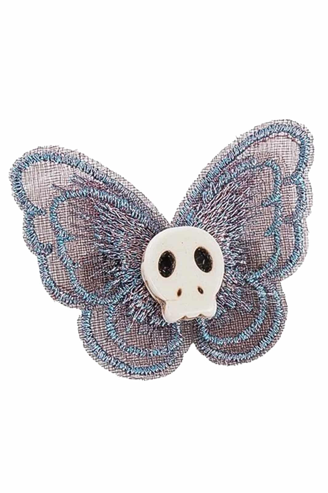 Blaue Haarklammern aus Polyester in Form eines Schmetterlings mit einem Totenkopf in der Mitte.