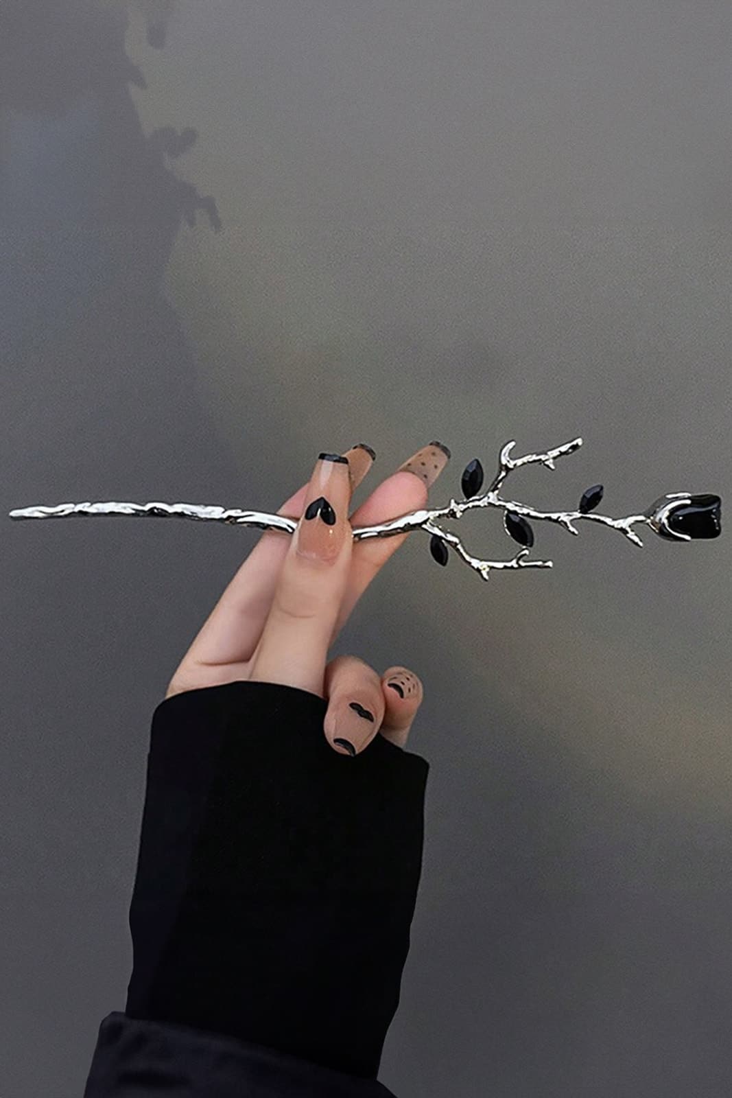 Okkulte, silberne Haarnadel aus Metall in Form einer Rose mit schwarzer Blüte aus Kunststoff und schwarzen Blättern.