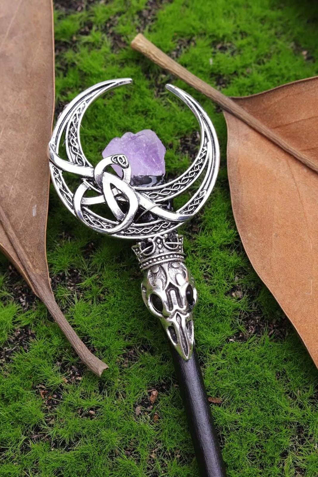 Schwarze Haarnadel mit silbernem Aufsatz in Form eines Halbmondes. Darunter hält ein Rabenschädel die Haarnadel aus Holz.