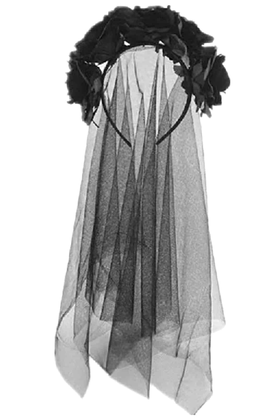 Ein romantisch-düsterer Haarreif mit schwarzen Blumen und langem, fließendem Schleier aus feinem Mesh. Das Design verleiht einen geheimnisvollen, dramatischen Look – ideal für Gothic-Events, Fotoshootings oder besondere Auftritte mit mystischem Flair.