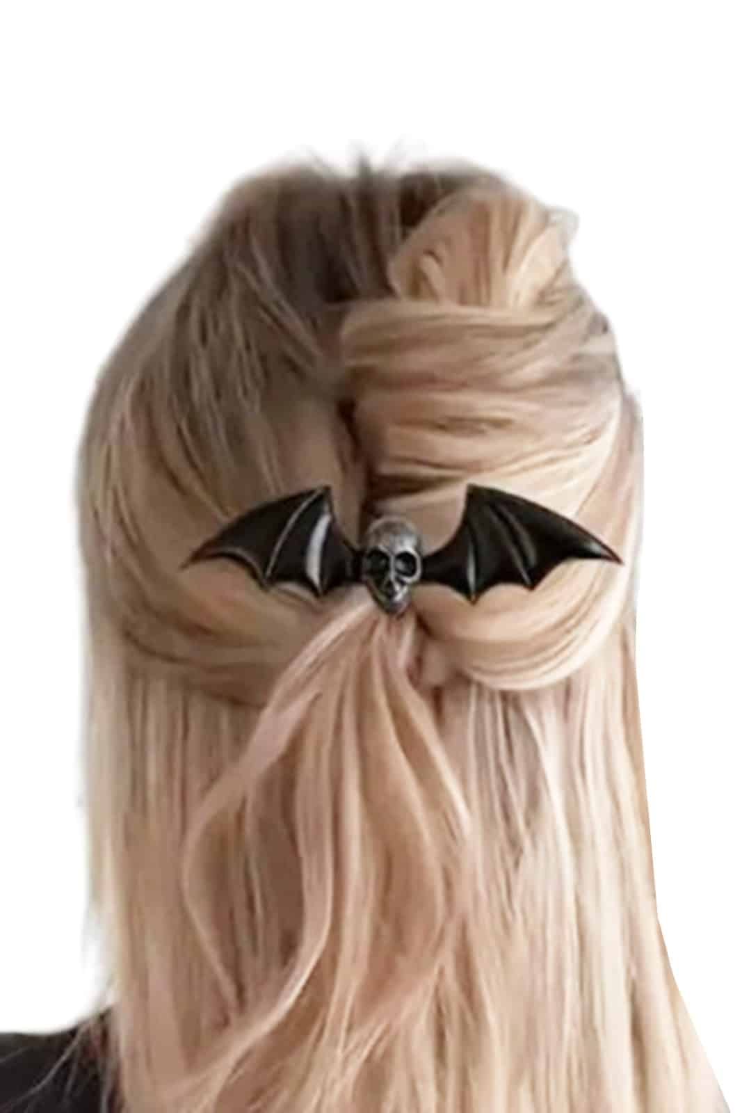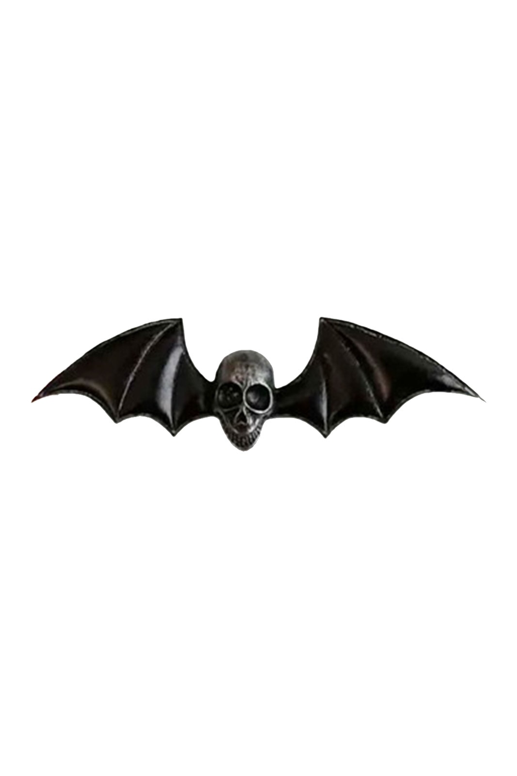 Schwarze Haarspange in Form einer Fledermaus mit großem Totenschädel in der Mitte.