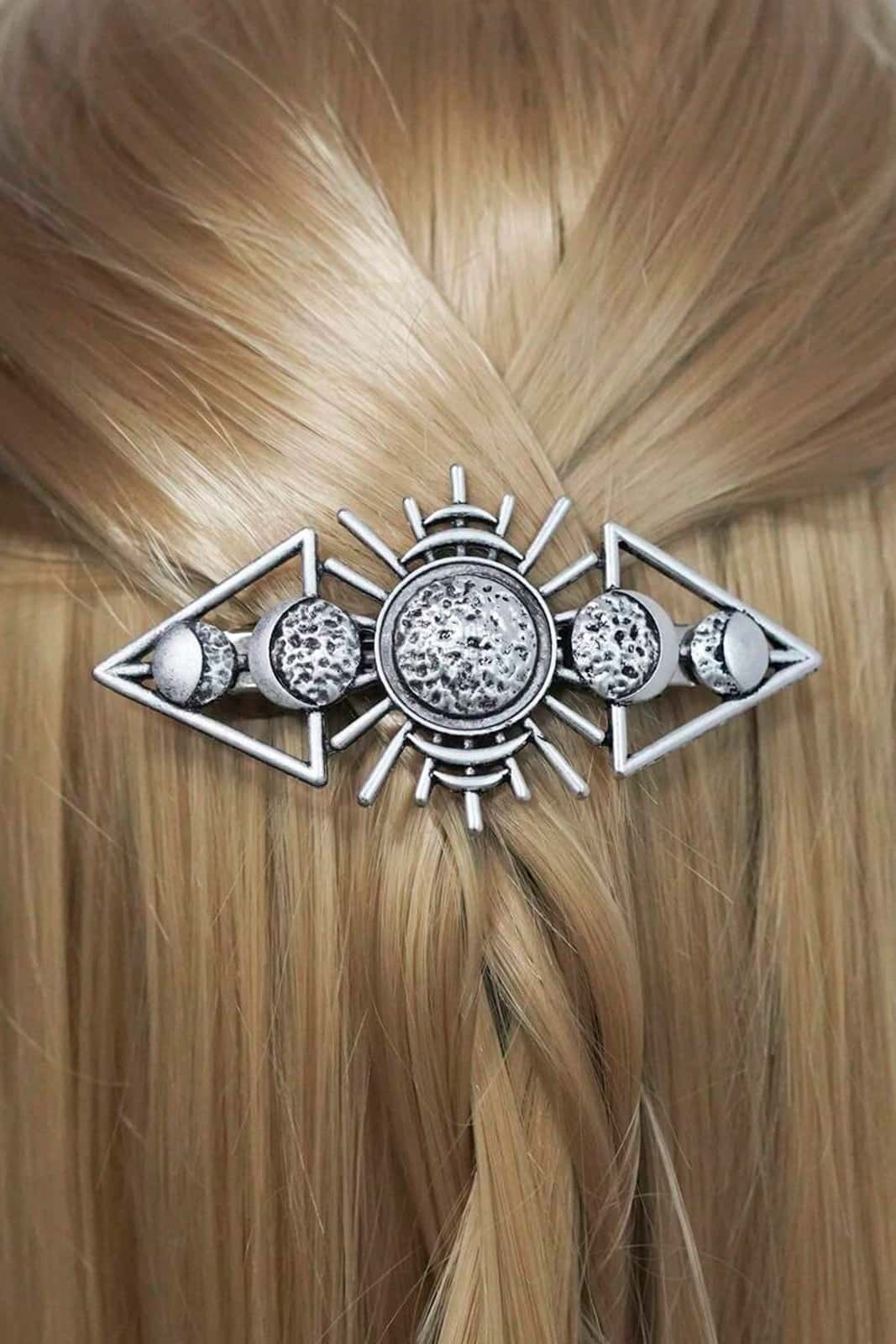 Klassische, silberne Haarspange mit 5 Mondphasen und geometrischen Formen