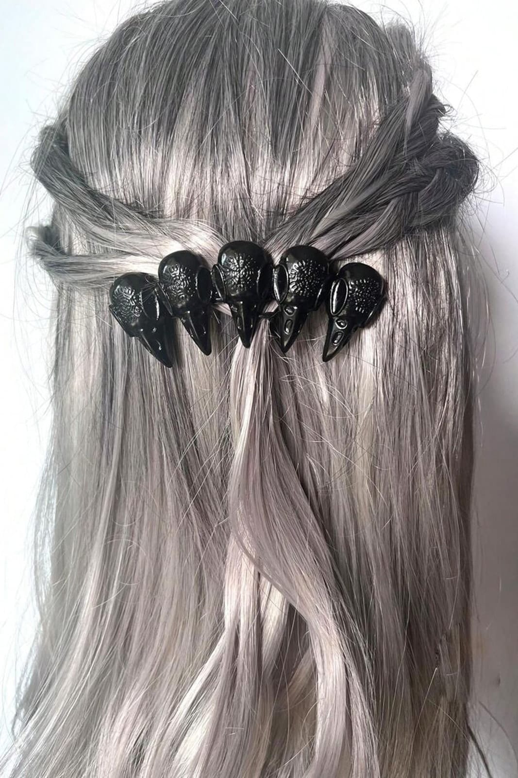 Schwarze Haarspange in Form von 5 Rabenschädeln aus einer robusten Zinklegierung.