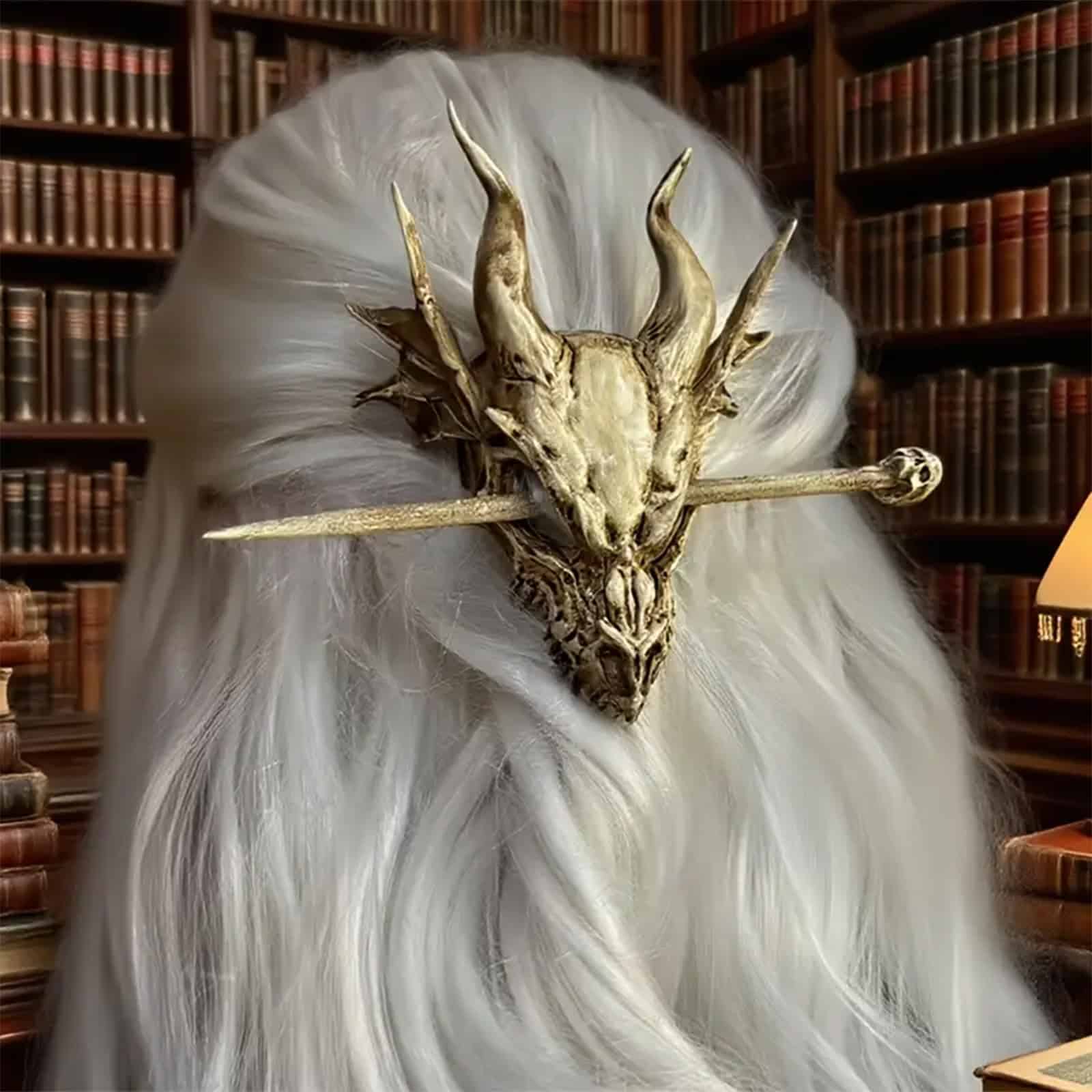 Die eindrucksvolle Draconis Crown Haarnadel vereint mystische Symbolik und kraftvolle Eleganz. Gefertigt aus detailreich gearbeitetem Harz, zeigt sie den Schädel eines Drachen mit geschwungenen Hörnern und markanten Konturen. Der dazugehörige Stab mit Totenkopfgriff fixiert das Haar sicher und verleiht deiner Frisur einen majestätisch-düsteren Touch – perfekt für Fantasy-, Gothic- und Cosplay-Looks.