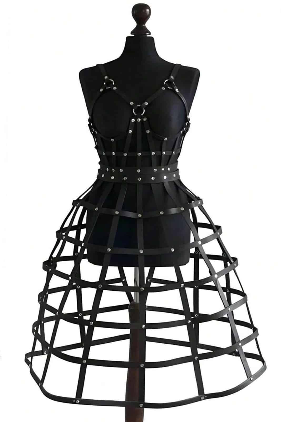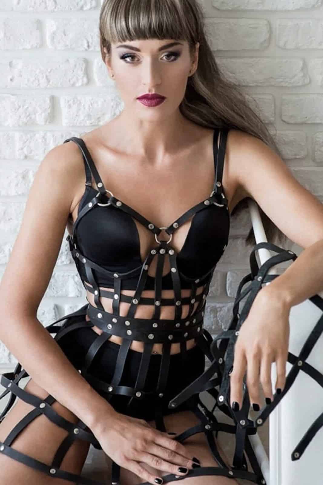 Harness in Form eines 2-teiligen Kleides aus hochwertigen Kunstlederriemen hergestellt.