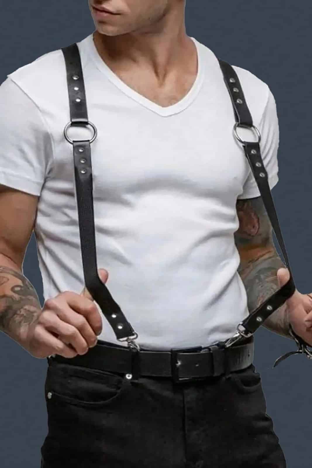 Gothic Hosenträger aus Kunstleder mit Karabinerverschluß zum Einhängen in die Gürtelschlaufen. Im Rücken verstellbar.
