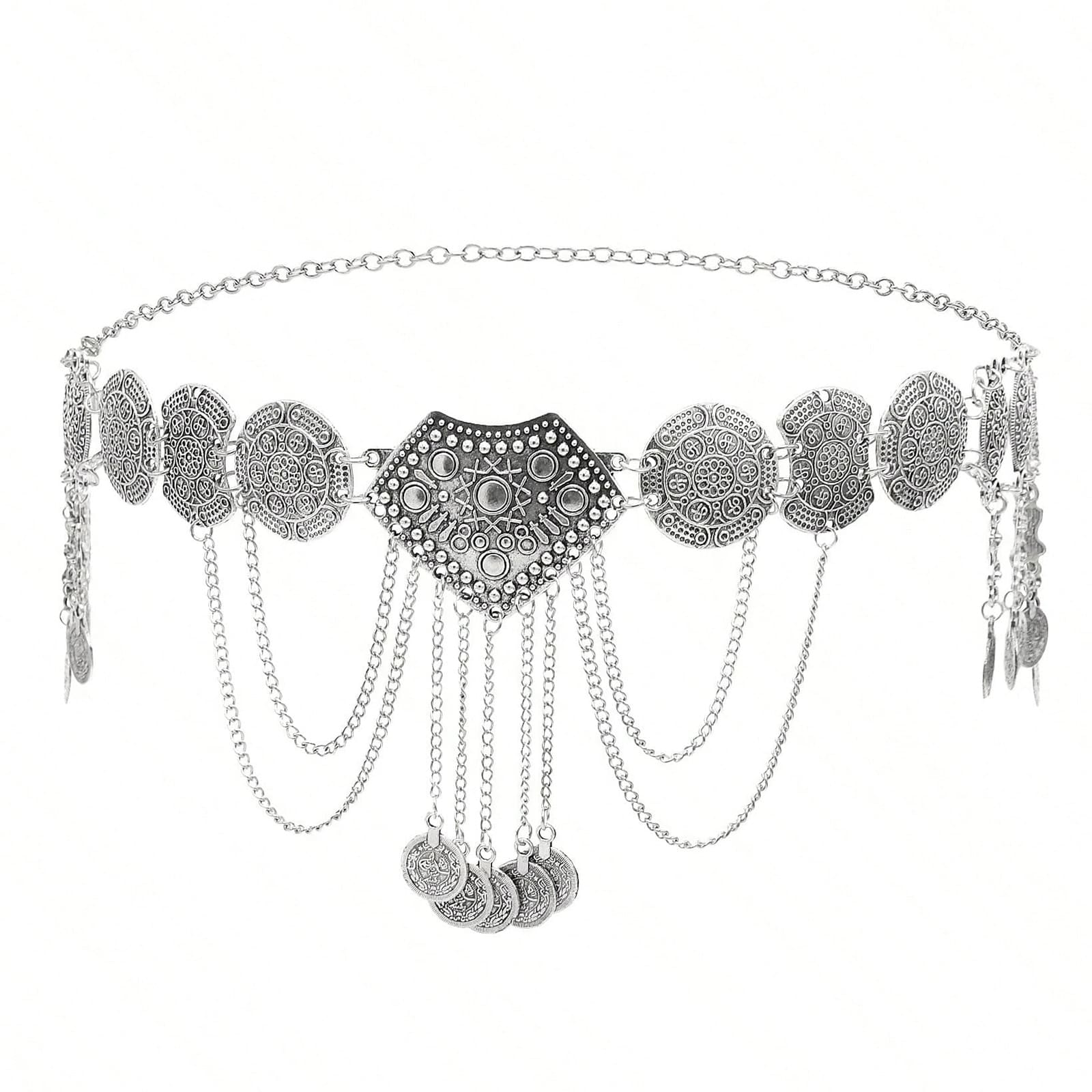 Elegante silberfarbene Hüftkette mit kunstvoll verzierten Ornamentplatten und tiefdunklen Schmucksteinen. Das zentrale Medaillon mit seinen mehrreihigen Münzanhängern setzt einen opulenten Fokuspunkt, während die seitlich herabfallenden Ketten bei jeder Bewegung einen zarten Klang und fließende Dynamik erzeugen. Ein idealer Akzent für Dresses, Röcke oder Festival-Outfits – von orientalisch inspiriert bis Gothic-Chic.