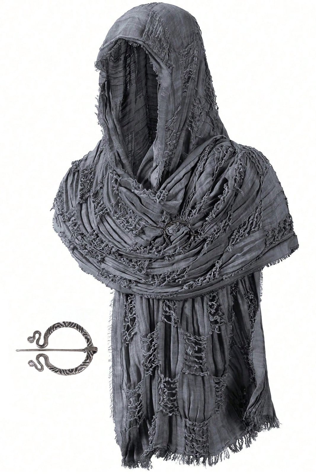 Vielseitiges mittelalterlich inspiriertes Kapuzenset in Renaissance-Optik, gefertigt aus robustem, texturiertem Stoff mit bewusst ausgefransten Akzenten. Die große Kapuze fällt tief und geheimnisvoll, während der Umhang durch flexible Verbindungspunkte individuell drapierbar ist. Mit dem detailreichen Wikinger-Anhänger und zusätzlichen Verschlussoptionen lässt sich das Set sowohl funktional als auch dekorativ anpassen – perfekt für LARP, Fantasy-Events, Märkte oder düstere Alltagsstyles.