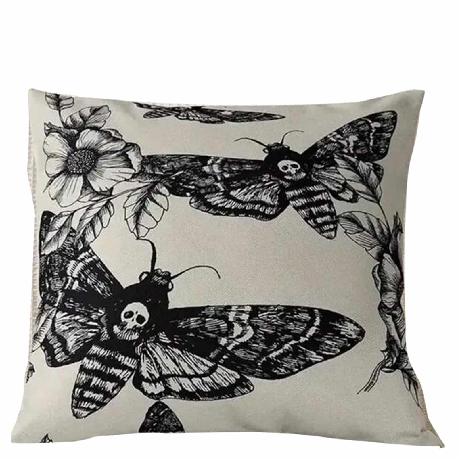 Die Death’s Whisper Kissenhülle vereint florale Eleganz mit düsterer Symbolik. Das Motiv zeigt detailreiche Totenkopfschwärmer, die sich über zarte Blüten ranken – ein Kontrast aus Leben und Vergänglichkeit, der jedem Raum eine geheimnisvolle Aura verleiht. Perfekt für Gothic-Interior, Dark Aesthetics oder als markantes Deko-Statement auf Sofa und Bett.