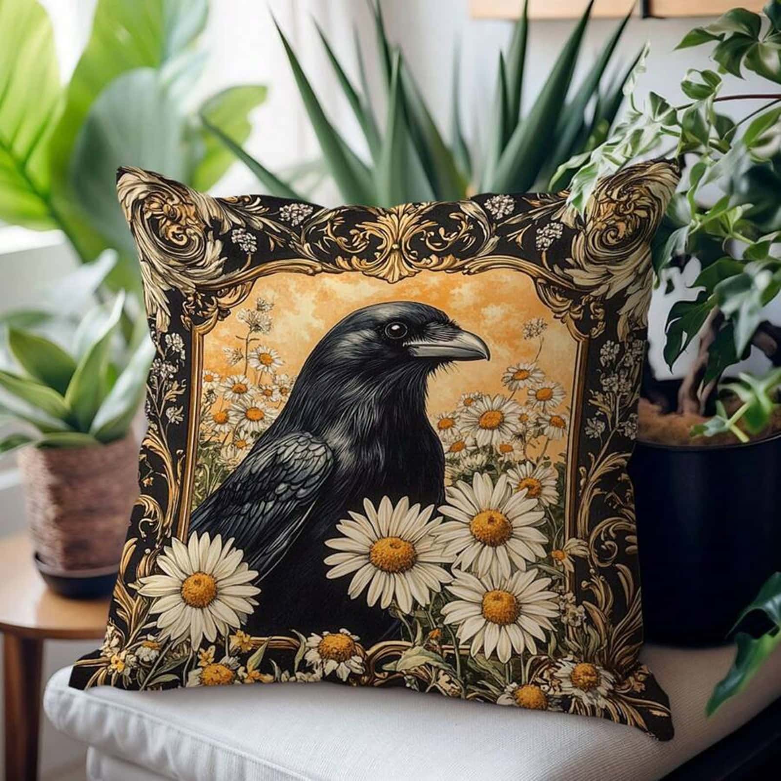 Ein stiller Wächter inmitten eines Sommerfelds – die Kissenhülle „Krähenflüstern“ bringt einen Hauch von Mystik und Naturverbundenheit in dein Zuhause. Im Zentrum steht eine detailreich gezeichnete Krähe, umgeben von blühenden Margeriten und eingerahmt von einem kunstvollen, goldverzierten Rahmen.