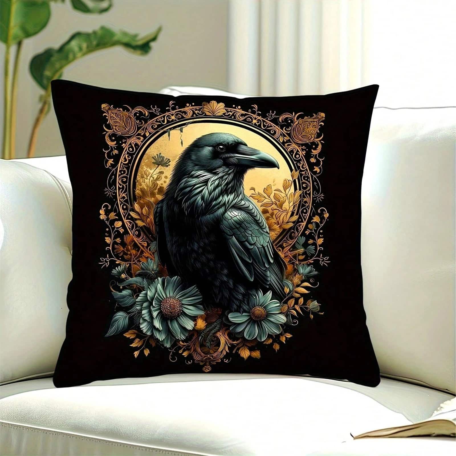 Dunkle Eleganz trifft auf mystische Symbolik – diese kunstvoll gestaltete Kissenhülle zeigt einen majestätischen Raben, eingerahmt von floralen Ornamenten im Vintage-Gothic Stil. Ein stilvoller Blickfang für Sofa, Sessel oder Schlafzimmer.