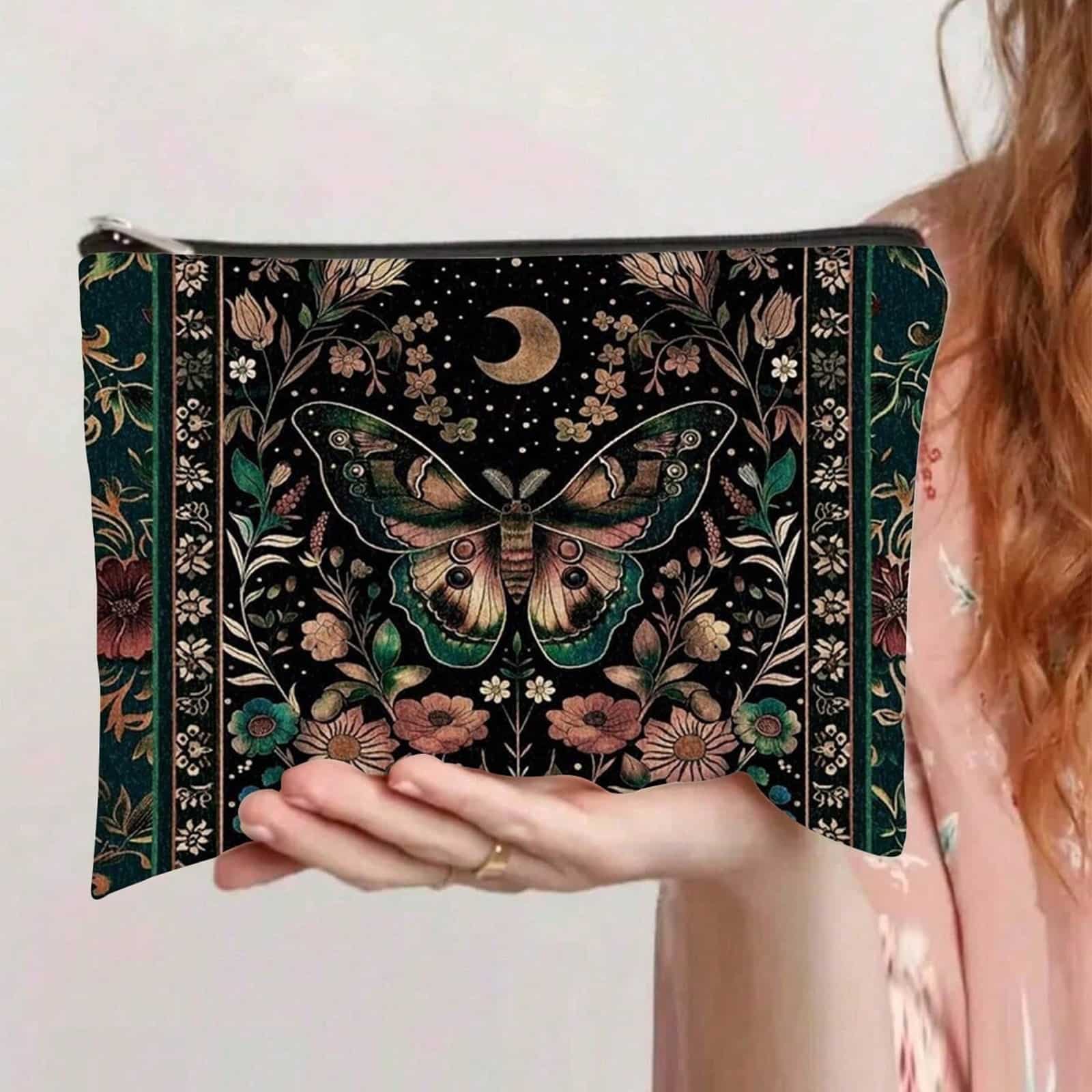 Die Moon Moth Kosmetiktasche vereint mystische Natur mit himmlischer Symbolik. Im Mittelpunkt steht ein kunstvoll verzierter Nachtfalter unter einem goldenen Halbmond, umgeben von floralen Ornamenten und Sternenhimmel. Mit ca. 21,5 x 15 cm bietet sie Platz für Make-up, Schmuck oder kleine Schätze – perfekt für alle, die Magie, Natur und Ästhetik lieben.