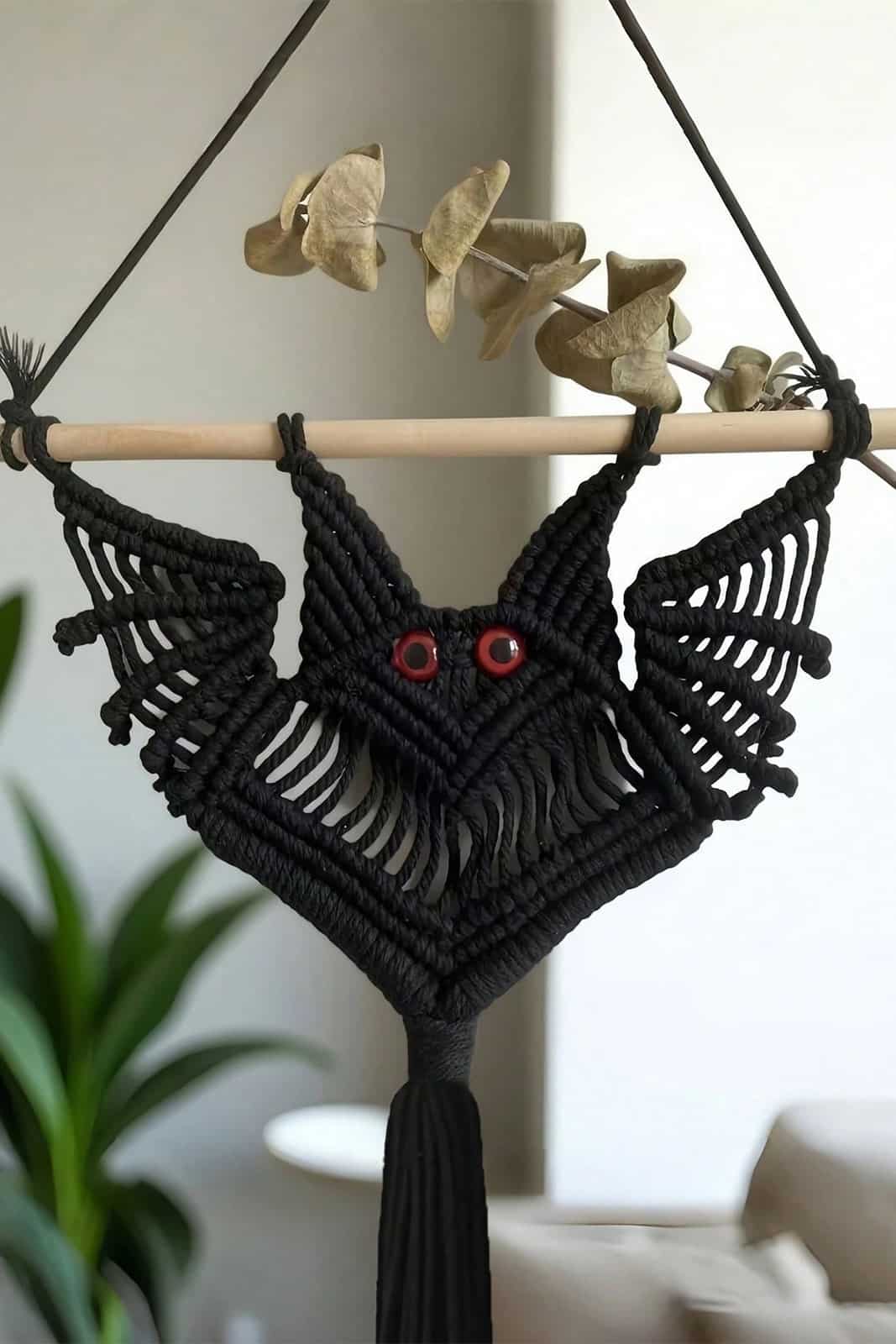 Der Macrame Bat Guardian verbindet Handwerkskunst mit mystischem Charme. Diese aufwendig geknüpfte Wanddekoration in Fledermausform symbolisiert Schutz und Geborgenheit – ein stiller Wächter über deinem Zuhause. Die leuchtend roten Augen setzen einen markanten Akzent und machen das Stück zu einem echten Blickfang in jeder Einrichtung.