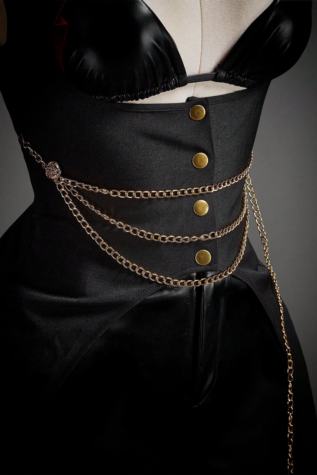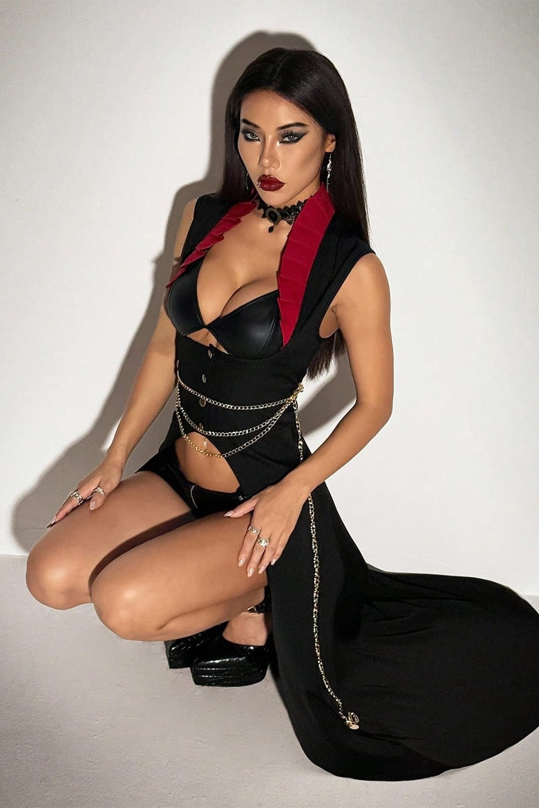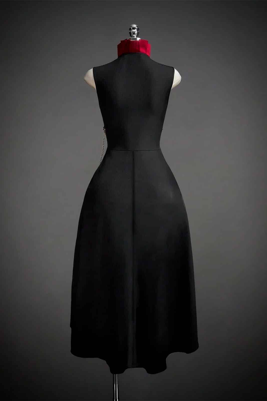 Dramatischer Gothic-Umhang mit figurbetontem Corsagen-Effekt und hohem Stehkragen in tiefem Blutrot. Die ärmellose Silhouette und der lange asymmetrische Schnitt verleihen Vampir- und Dark-Aristocracy-Vibes, während goldene Zierketten Taille und Hüfte akzentuieren. Aus 98 % Polyester und 2 % Spandex gefertigt, kombiniert dieses Stück Eleganz, Dunkelromantik und Bühnenpräsenz – ideal als Mantel, Corsagen-Überwurf oder dramatisches Kostümhighlight.