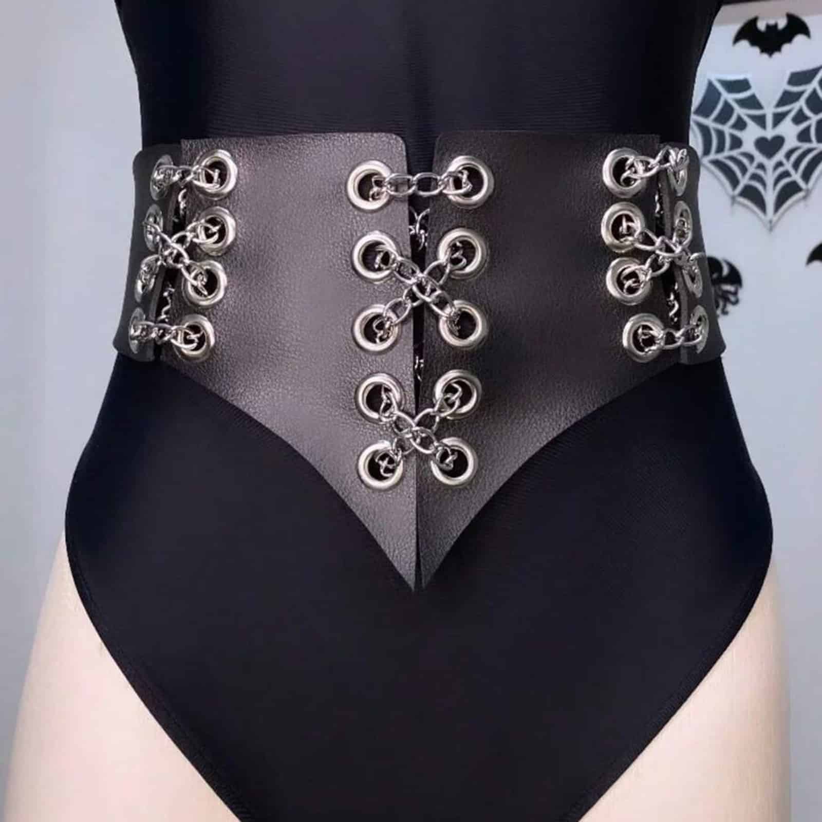 Der Miedergürtel Coven Mark wirkt wie ein Relikt aus einer anderen Welt – kraftvoll, mysteriös und rituell. Geschwärztes Kunstleder formt eine dramatische Silhouette, während silberne Ösen und Kettenbindungen an alte Beschwörungen erinnern. Die spitz zulaufende Front wirkt wie das Zeichen eines dunklen Bundes – geschaffen für nächtliche Versammlungen und stilvolle Schattenwesen.