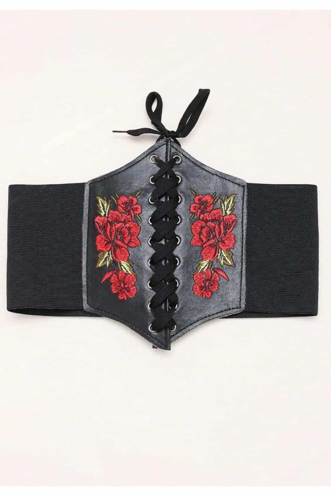 Ausdrucksstarker Miedergürtel mit schwarzer Kunstleder-Front und aufwendig gestickten roten Rosen. Die klassische Schnürung betont die Taille, während die elastische Rückseite aus Polyester mit praktischem Druckknopfverschluss für angenehmen Tragekomfort sorgt. Perfekt als markanter Akzent zu Kleidern, Blusen oder Gothic-Outfits.