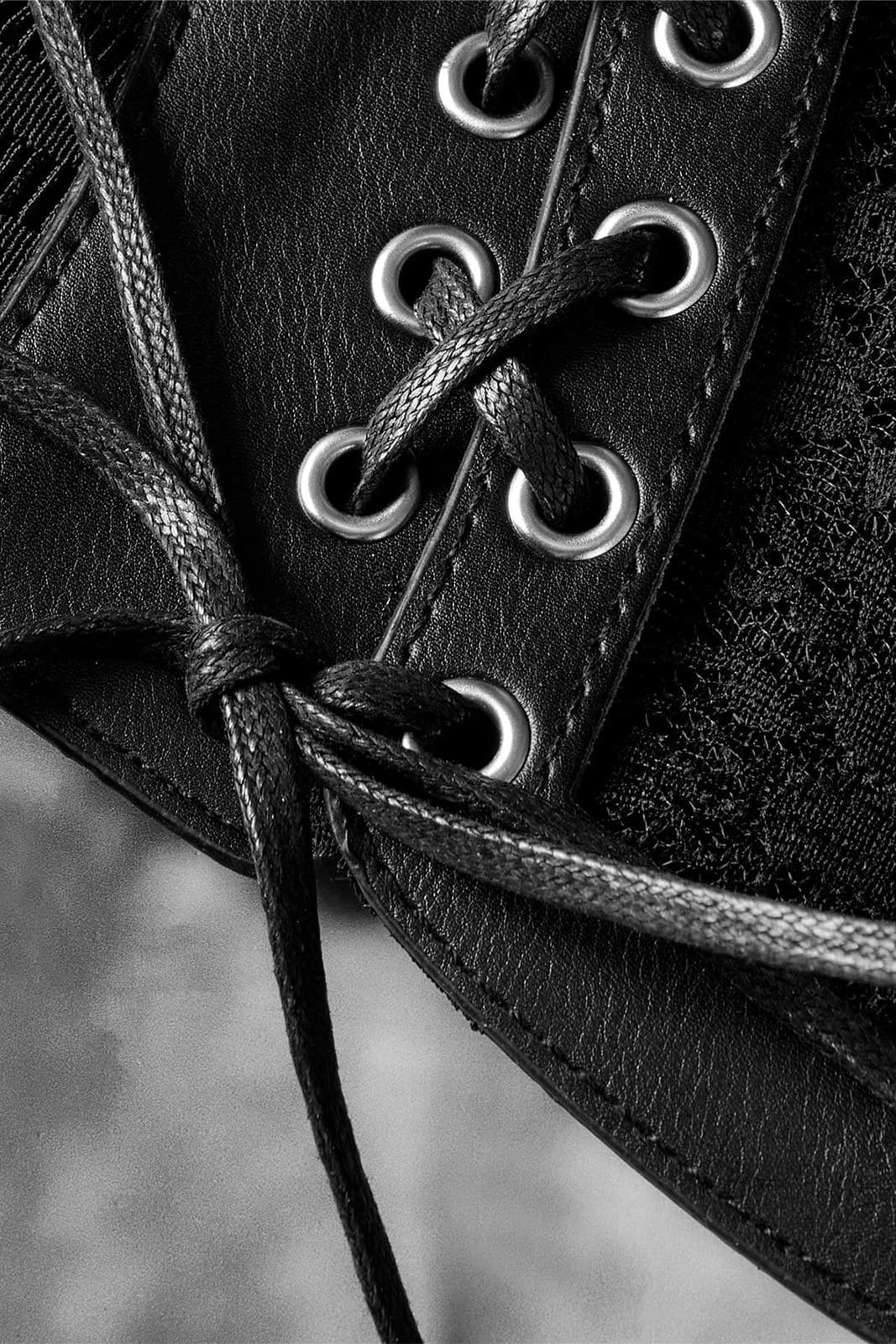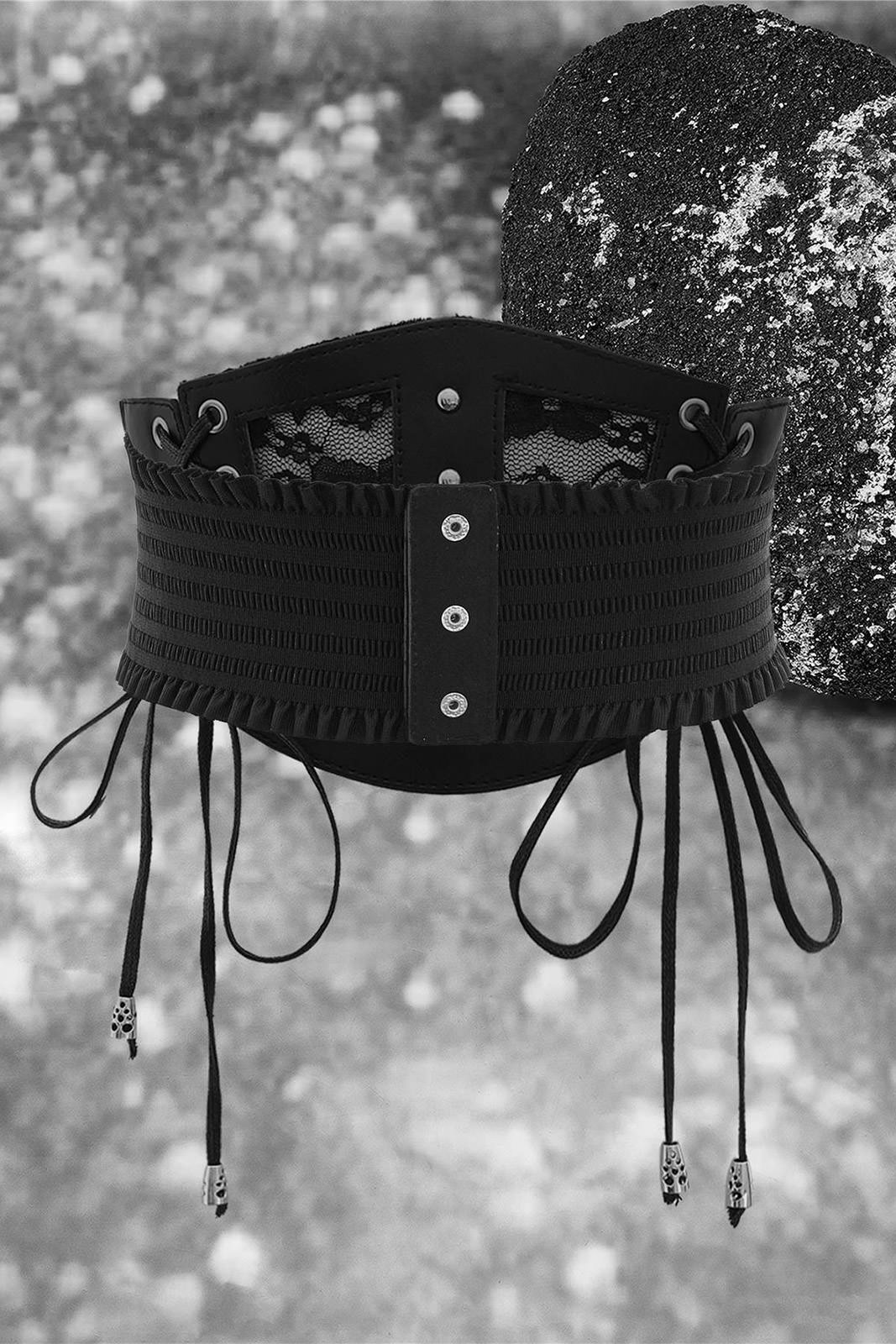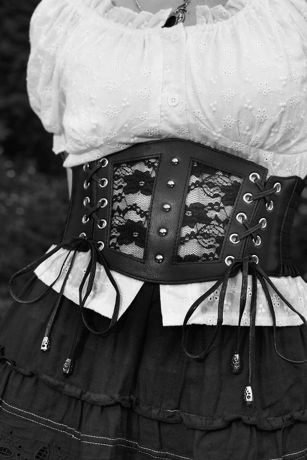 Wunderschöner Miedergürtel mit zwei großen Ausschnitten an der Front die mit floralem Spitzenstoff überzogen sind. Der elastische Teil im Rücken ist mit Druckknöpfen bestückt. Über die seitliche Schnürung kann die Länge angepasst werden.