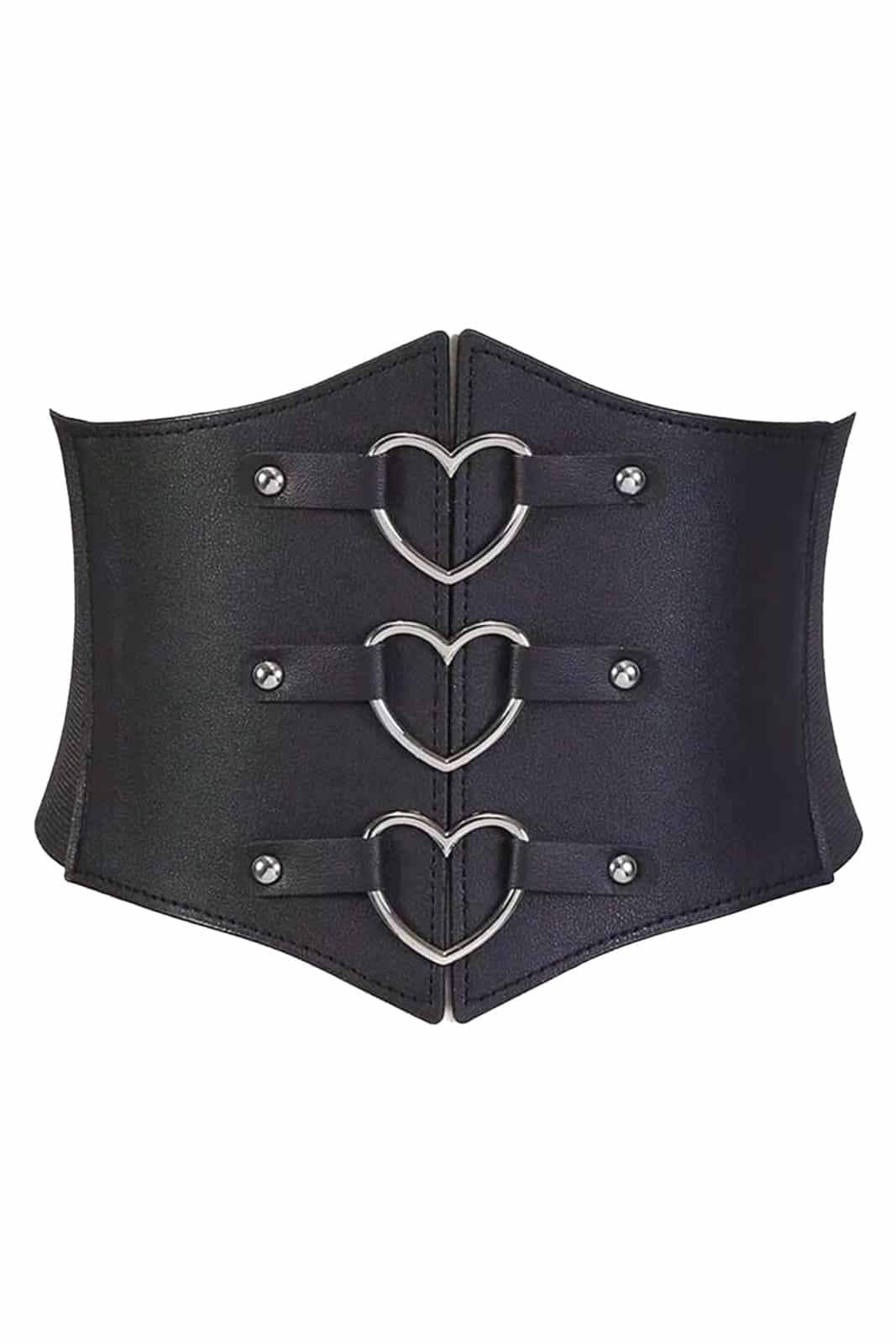 Dieser Miedergürtel aus schwarzem Kunstleder verleiht jedem Outfit eine extravagante Silhouette. Drei silberfarbene Herzschnallen auf der Vorderseite setzen auffällige Akzente und sorgen für eine Mischung aus Romantik und Dark Aesthetic. Der elastische Rückenteil mit Druckknopf-Verschluss bietet hohen Tragekomfort und eine flexible Passform. Ob über Kleidern, Tops oder Blusen – dieser Taillengürtel ist das perfekte Accessoire für Gothic-, Alternative- oder Festival-Looks.