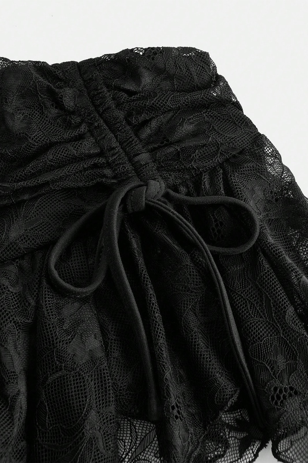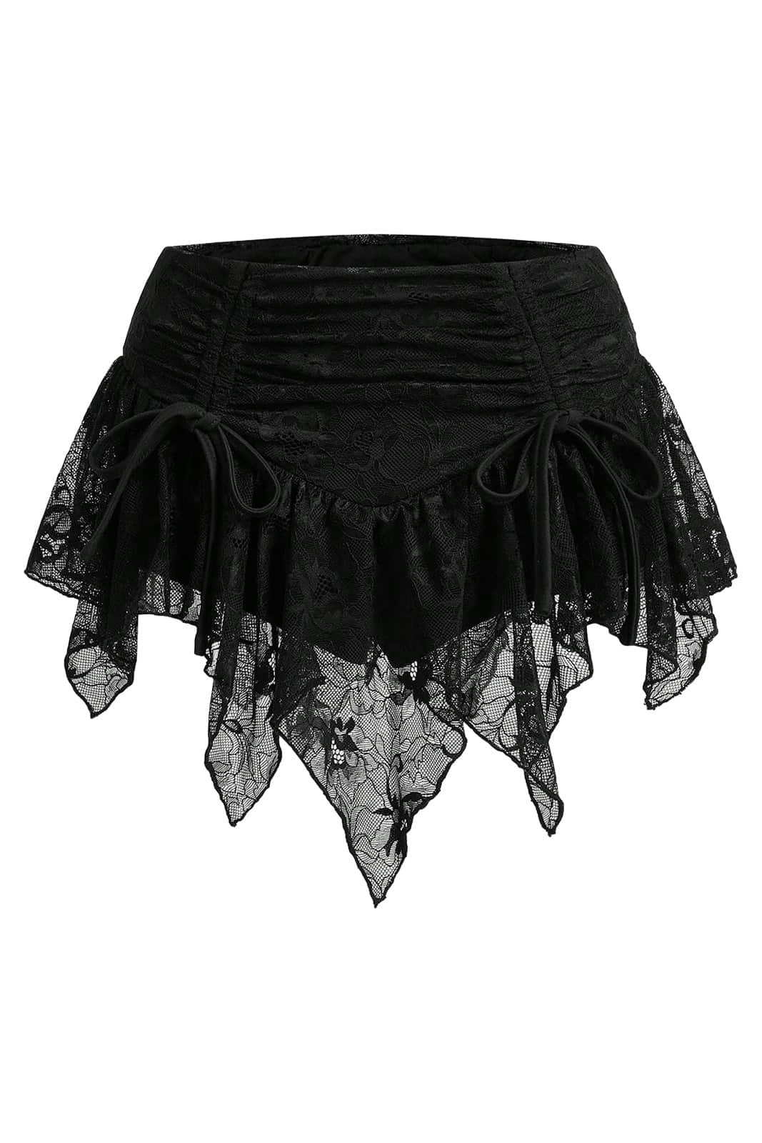 Dunkelromantisch und verspielt – der Midnight Lace Spell Minirock vereint zarte Spitze mit einer auffälligen Zipfelsilhouette. Die seitlichen Bindebänder und die geraffte Partie setzen feminine Akzente, während der niedrige Bund für einen lässigen, verführerischen Sitz sorgt. Perfekt für Gothic-Looks mit Corsage, Mesh-Top oder Plateau-Boots.