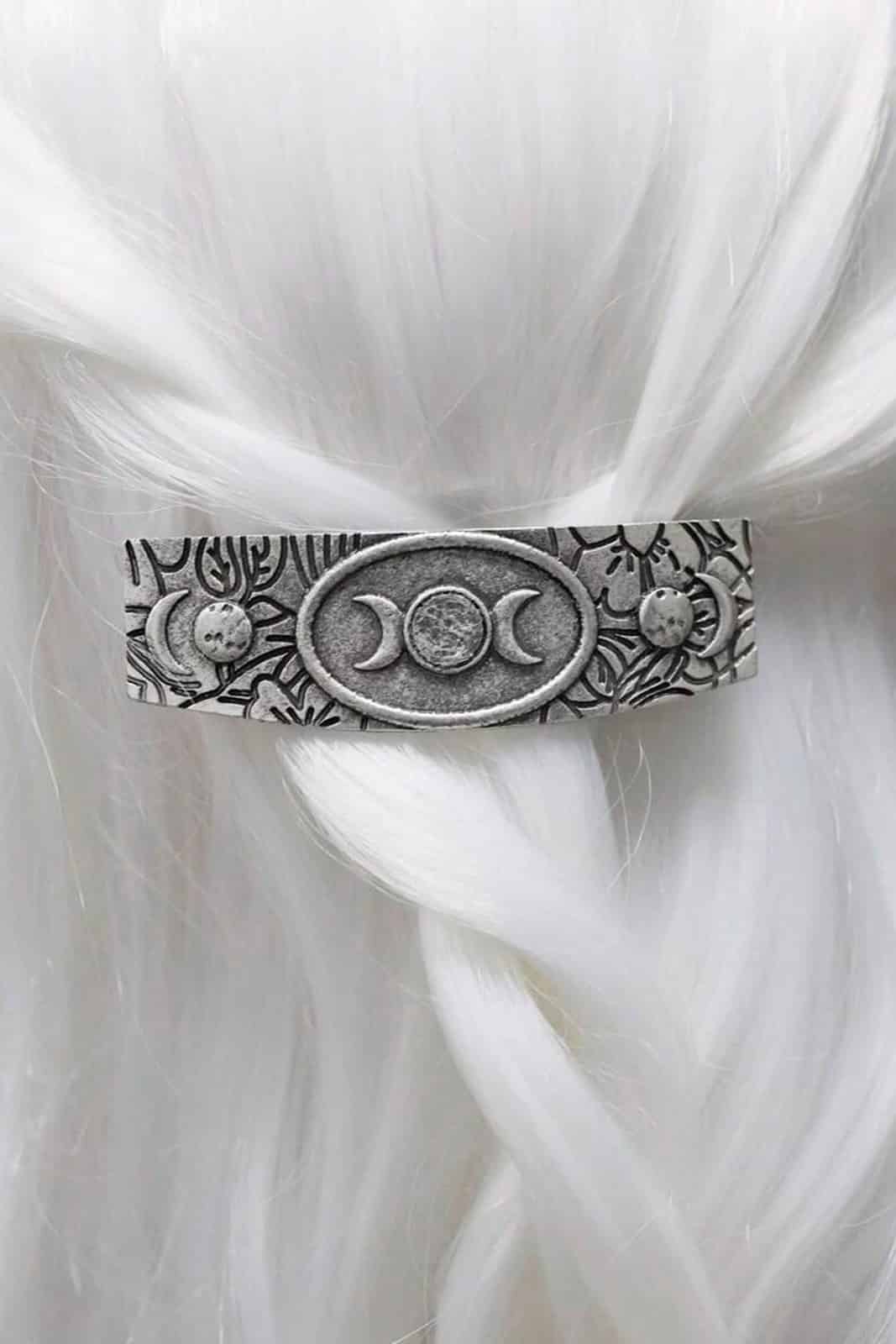 Klassische, silberne Haarspange mit einer breiten Grundplatte, die mit Blumenmuster graviert ist und Monde zur Zierde hat