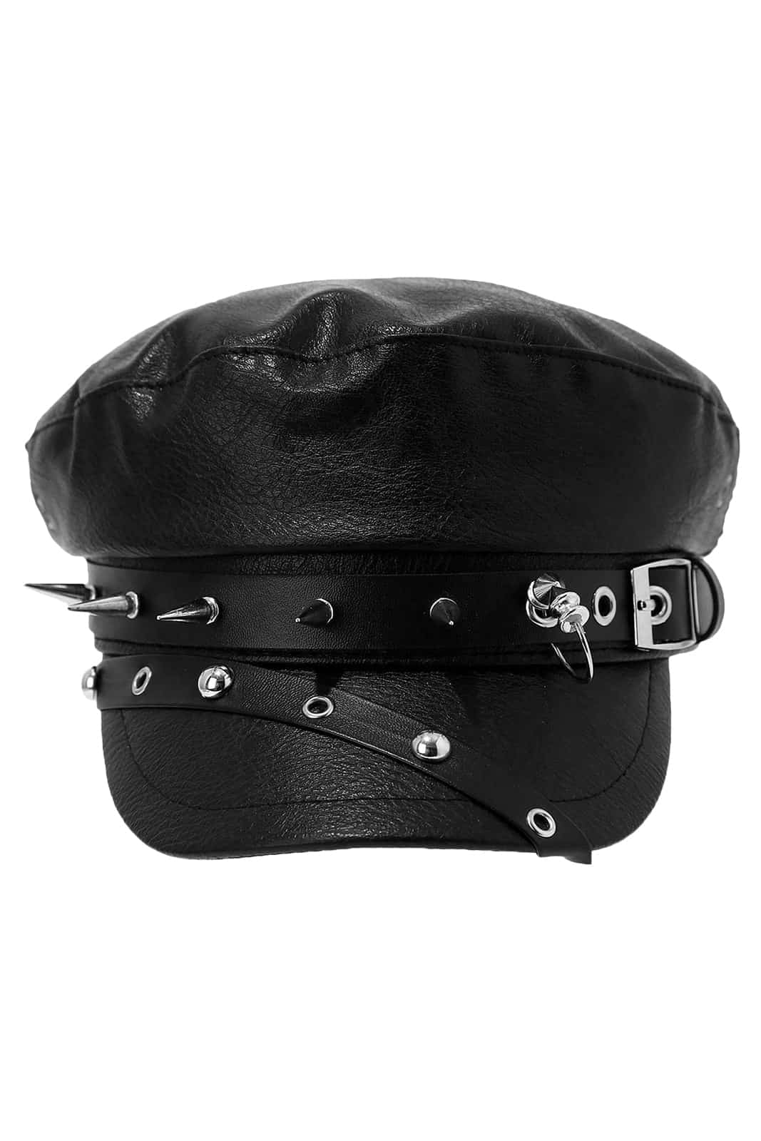 Diese markante Mütze kombiniert klassischen Biker-Style mit kompromissloser Punk-Attitüde. Das matte Kunstleder wird von einem umlaufenden Riemen mit Spikes, Ösen und Ringdetails durchzogen und verleiht dem Design eine aggressive, rebellische Note. Schnalle und Nieten setzen metallische Akzente und machen die Mütze zum perfekten Statement-Accessoire für Gothic-, Punk- und Alternative-Looks.