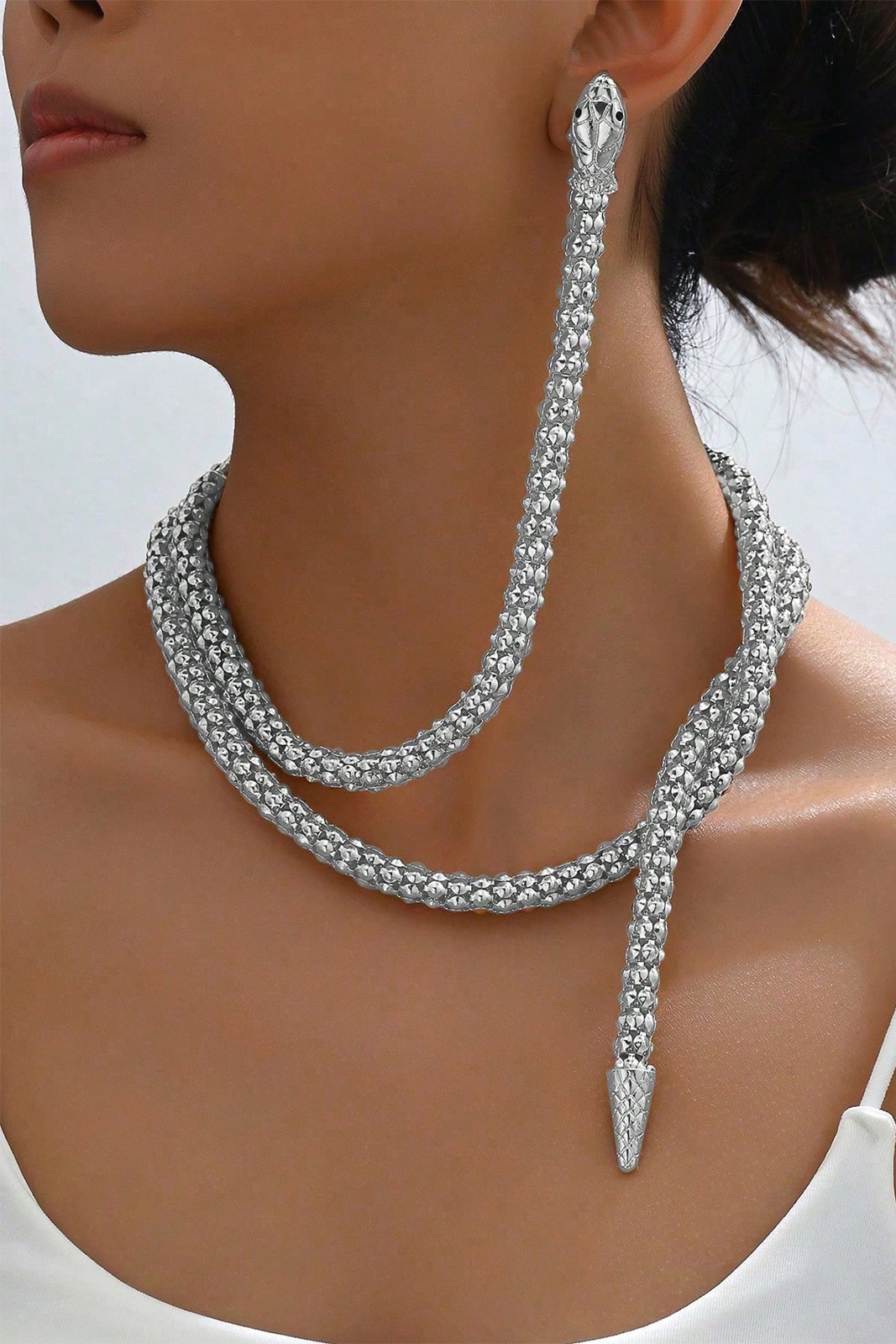 Dramatische Ohrring-Kettenkombi im Stil einer geschwungenen Nachtschlange, inspiriert von der geheimnisvollen Vipera berus. Die strukturierte, schuppenartige Oberfläche und die flexiblen, lang fallenden Stränge erzeugen den Eindruck einer anmutig gleitenden Schlange, die sich elegant um Hals und Schulter legt. Ein extravagantes Statement-Piece für mutige Looks – sinnlich, dunkel und absolut unverwechselbar.
