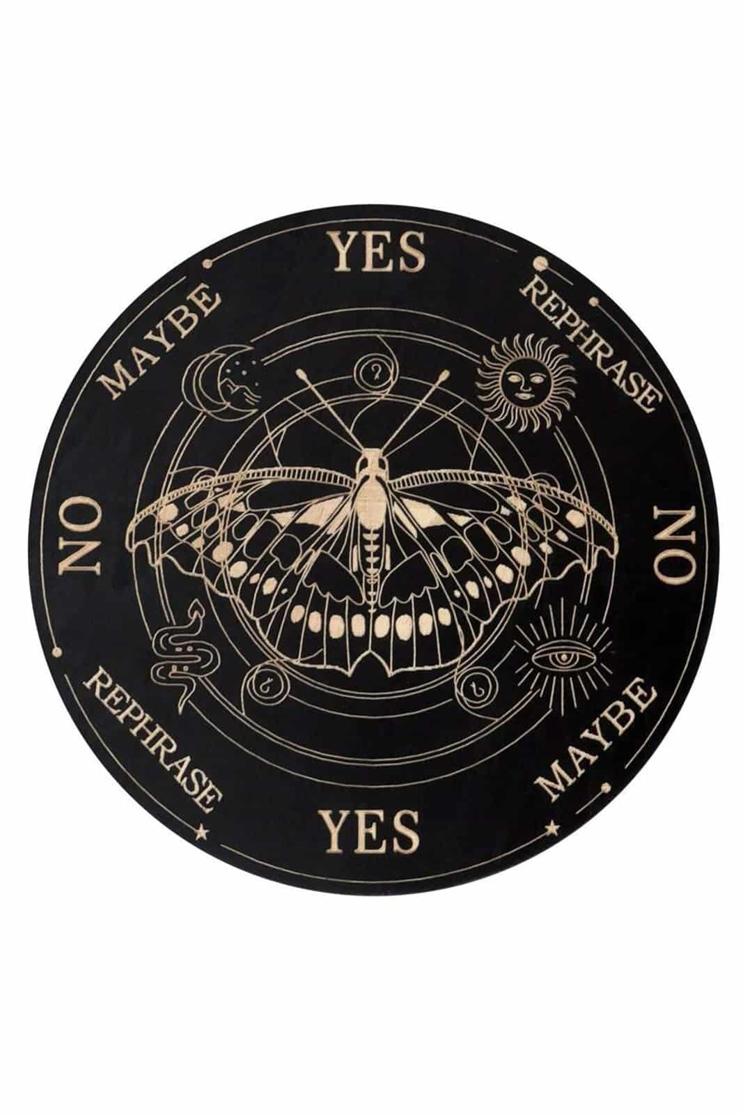 Rundes Ouija Brett aus Holz. Schwarz mit ausgesparten Ouija Motiven und einem großen Schmetterling in der Mitte.
