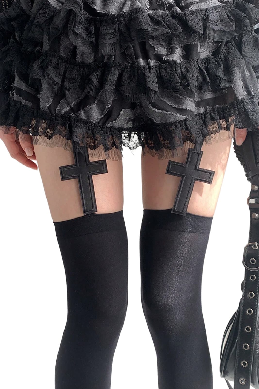 Diese außergewöhnlichen Strümpfe verbinden düstere Eleganz mit einem Hauch okkulter Symbolik. Das markante Kreuzmotiv auf den Oberschenkeln wirkt wie ein geheimnisvolles Siegel, das jedem Outfit eine mystische Aura verleiht. Gefertigt aus weichem, elastischem Material schmiegen sie sich perfekt an die Beine an. Das integrierte Taillenband – auf den Bildern verborgen – sorgt für sicheren Halt, auch bei langen Nächten zwischen Ritual und Tanz. Ein Accessoire für alle, die zwischen sakraler Ästhetik und dunkler Verführung wandeln.