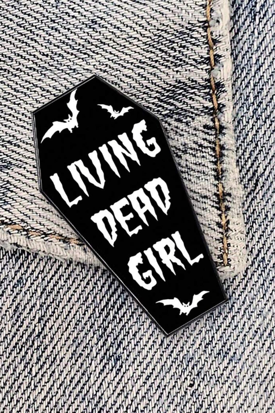 Schwarzer Metall-Pin in Form eines Sargs mit der Inschrift Living Dead Girl und Fledermäusen.