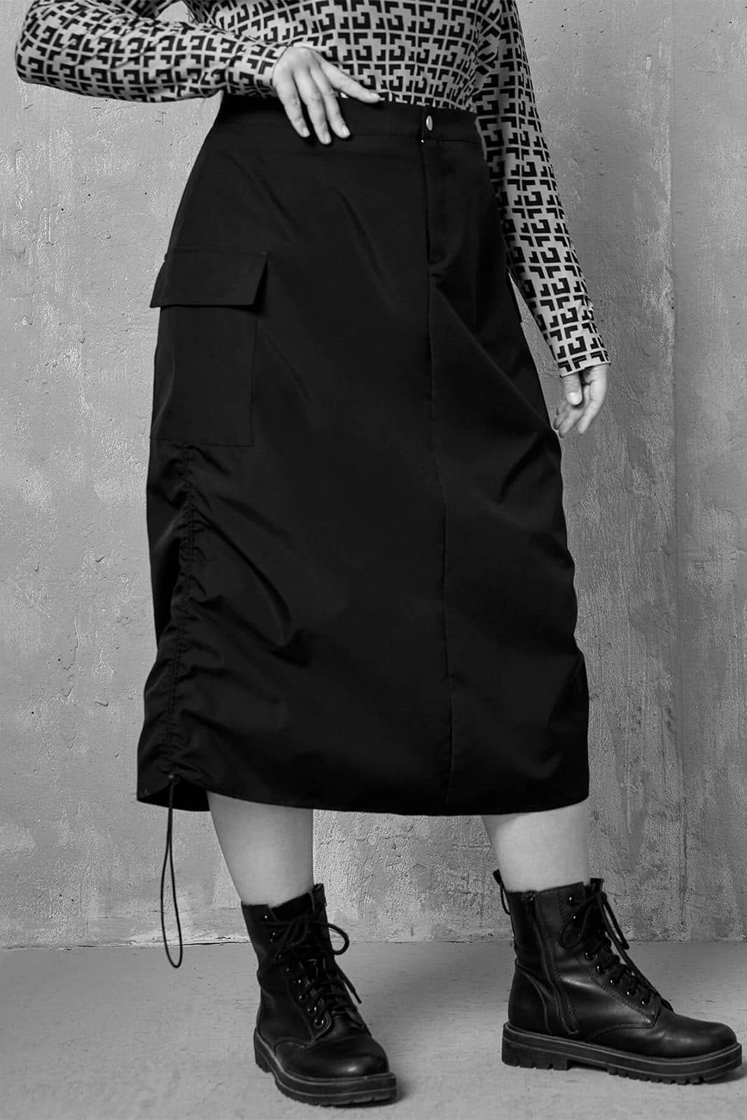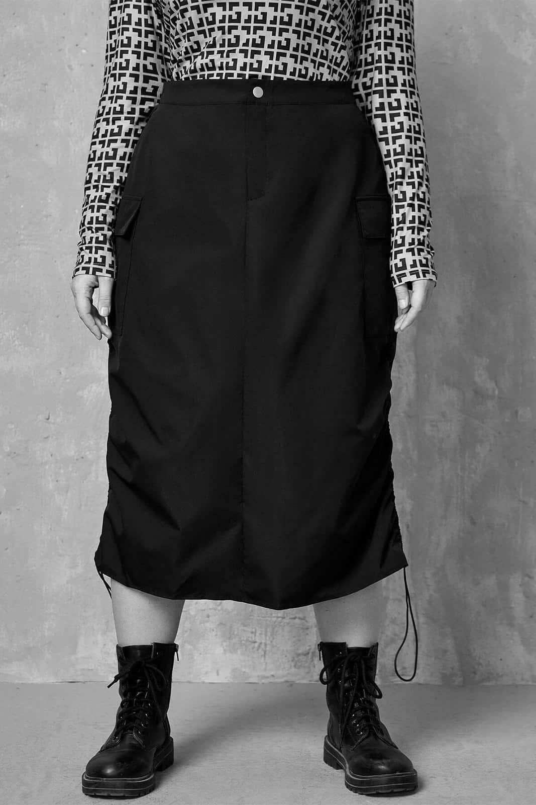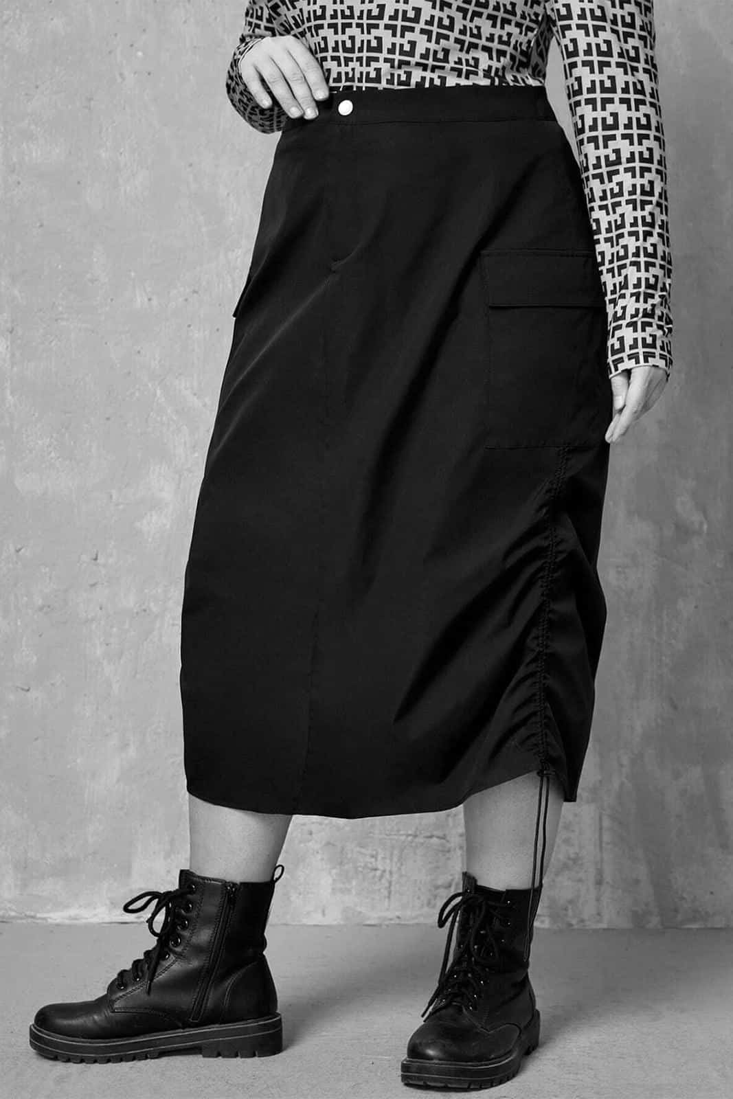 Damenrock mit festem Bund, Knopf und Reißverschluß. Ausgestattet mit zwei aufgesetzten Taschen und Kordelzug am unteren Saum.