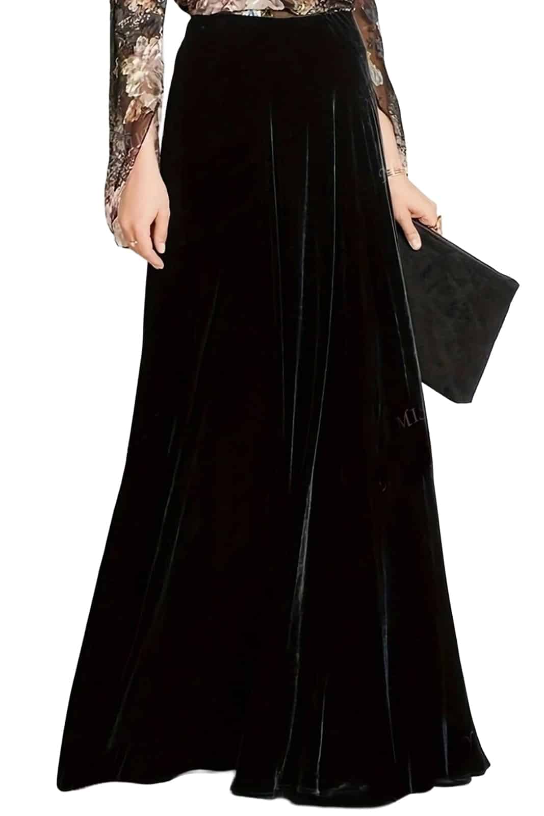 Die samtige Oberfläche reflektiert das Licht wie Kirchenfenster in der Dämmerung – weich, gedämpft, geheimnisvoll. Dieser Rock ist nicht einfach ein Kleidungsstück – er ist eine stille Liturgie in Bewegung, geschaffen für jene, die mit jeder Geste Würde ausstrahlen.