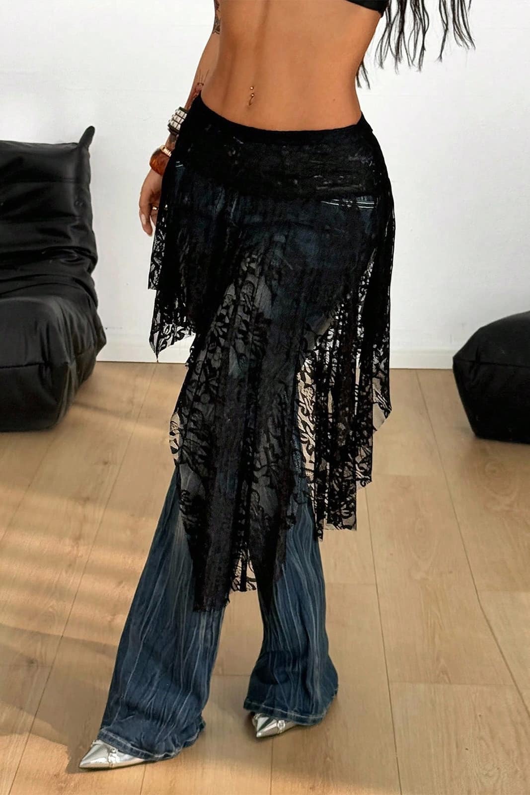 Dieser asymmetrische Spitzenrock ist ein Statement aus dunkler Eleganz und wilder Freiheit. Leichte, transparente Spitze fällt in unregelmäßigen Lagen über Hüfte und Beine und sorgt für einen dramatischen, schwebenden Effekt – perfekt über Hosen, Leggings oder als extravagantes Festival- und Clubpiece. Der elastische Bund passt sich bequem der Figur an, während der fein ornamentierte Spitzenstoff mit seiner düsteren Note ideal zu Gothic, Boho und Alternative Styles harmoniert.