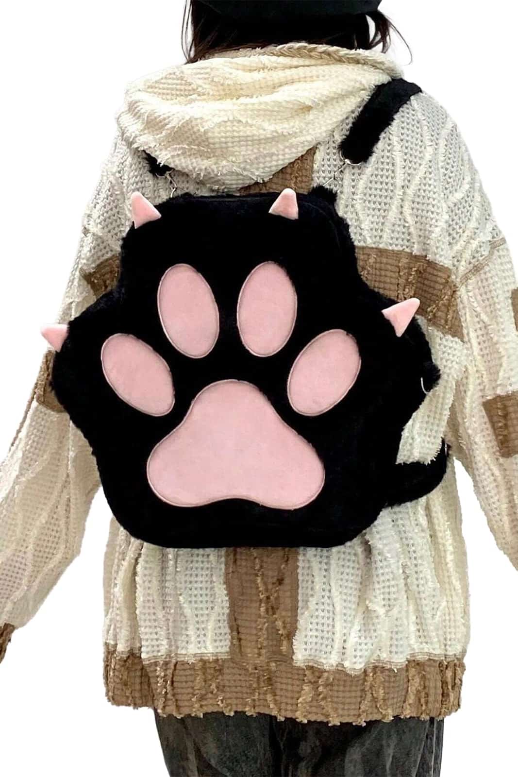 Dieser auffällige Rucksack vereint verspielte Niedlichkeit mit einem dunklen, alternativen Look. Die große Pfoten-Applikation in zartem Rosa setzt einen starken Kontrast zum tiefschwarzen, flauschigen Material und macht den Rucksack zu einem echten Statement-Piece. Ideal für Alltag, Festivals oder als besonderes Accessoire für alle, die Cute & Dark lieben.