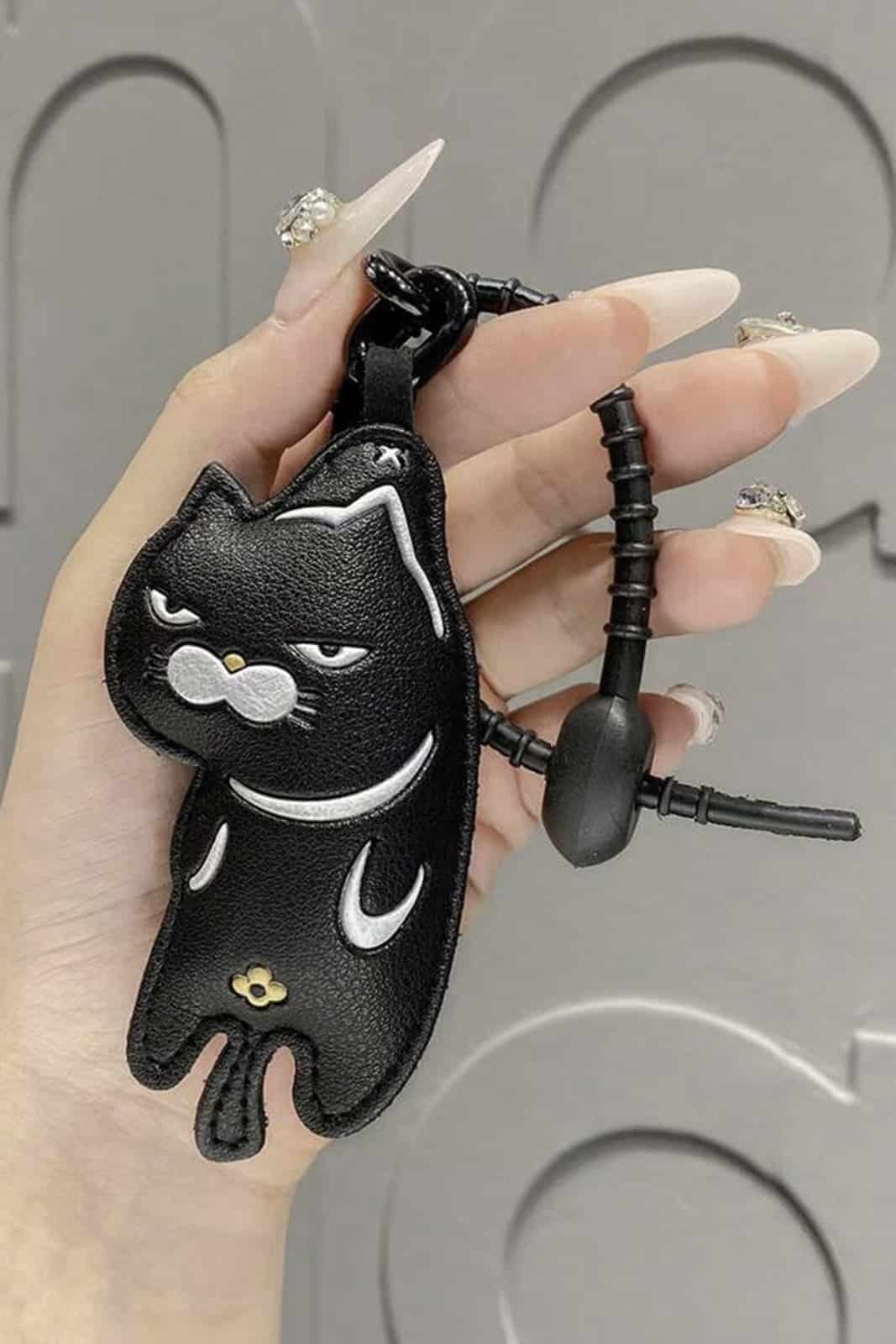 Schlüsselanhänger in Form einer süßen schwarzen Katze aus Kunstleder mit weißem Ohr.