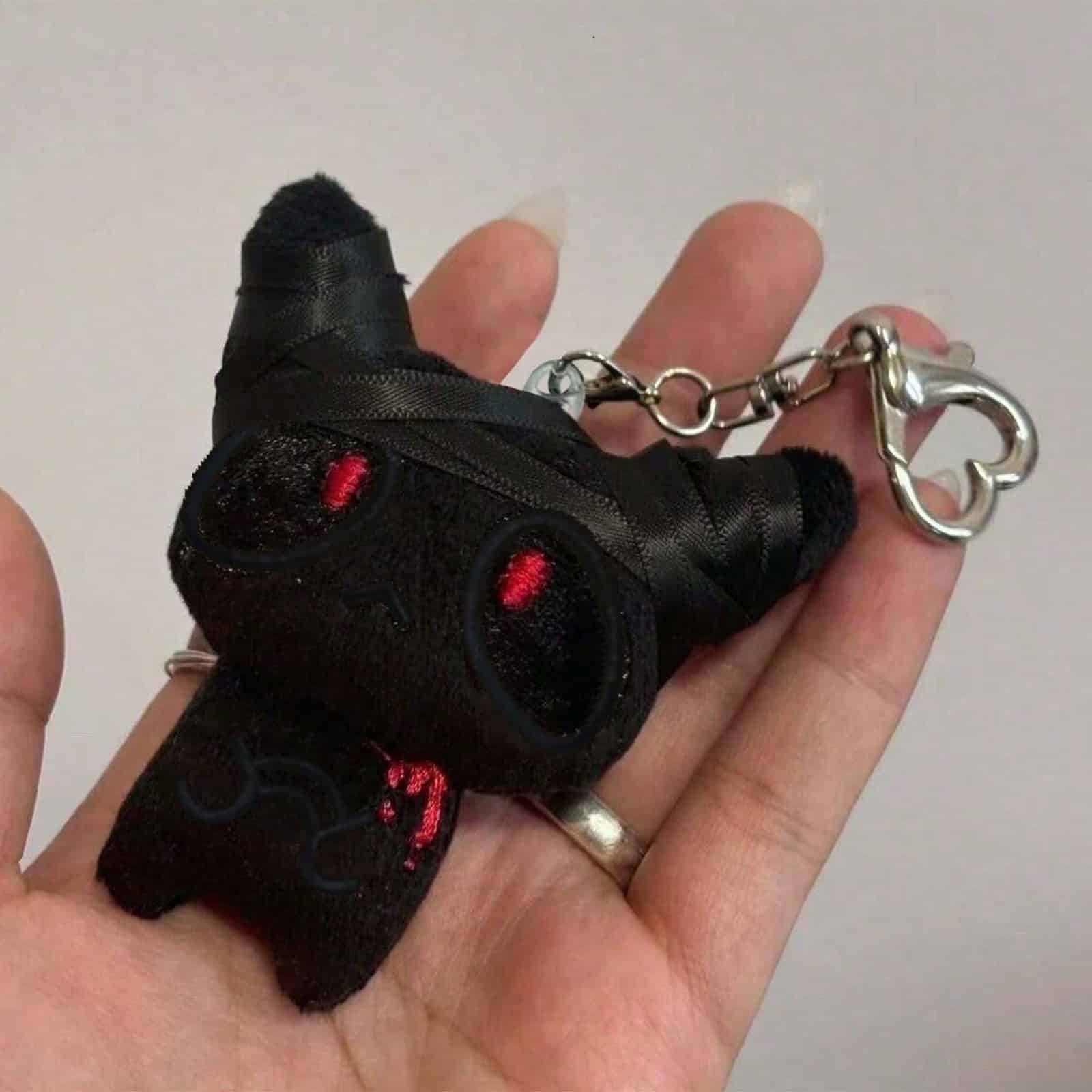 Der Shadow Guardian Keychain ist dein stiller Beschützer in Plüschform. Mit seinen leuchtend roten Augen und dem dunklen, bandumwickelten Körper erinnert er an einen kleinen Schutzgeist aus der Schattenwelt – wachsam, mystisch und stets an deiner Seite. Perfekt als Talisman für Schlüssel, Taschen oder Rucksäcke.