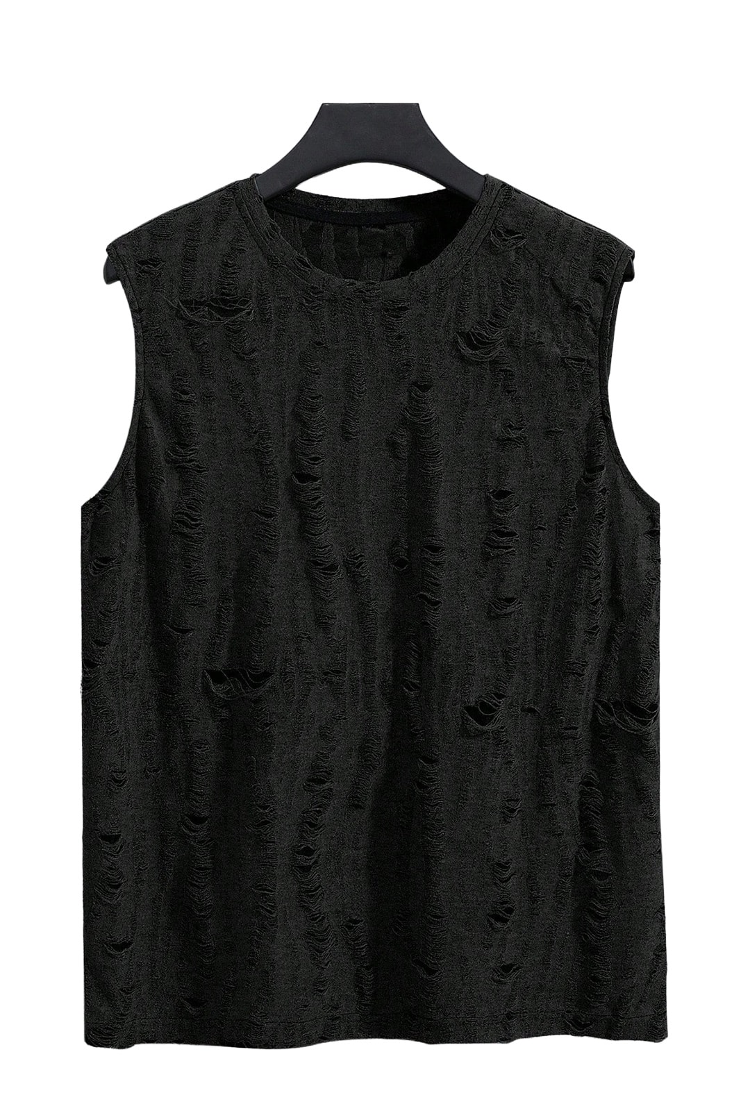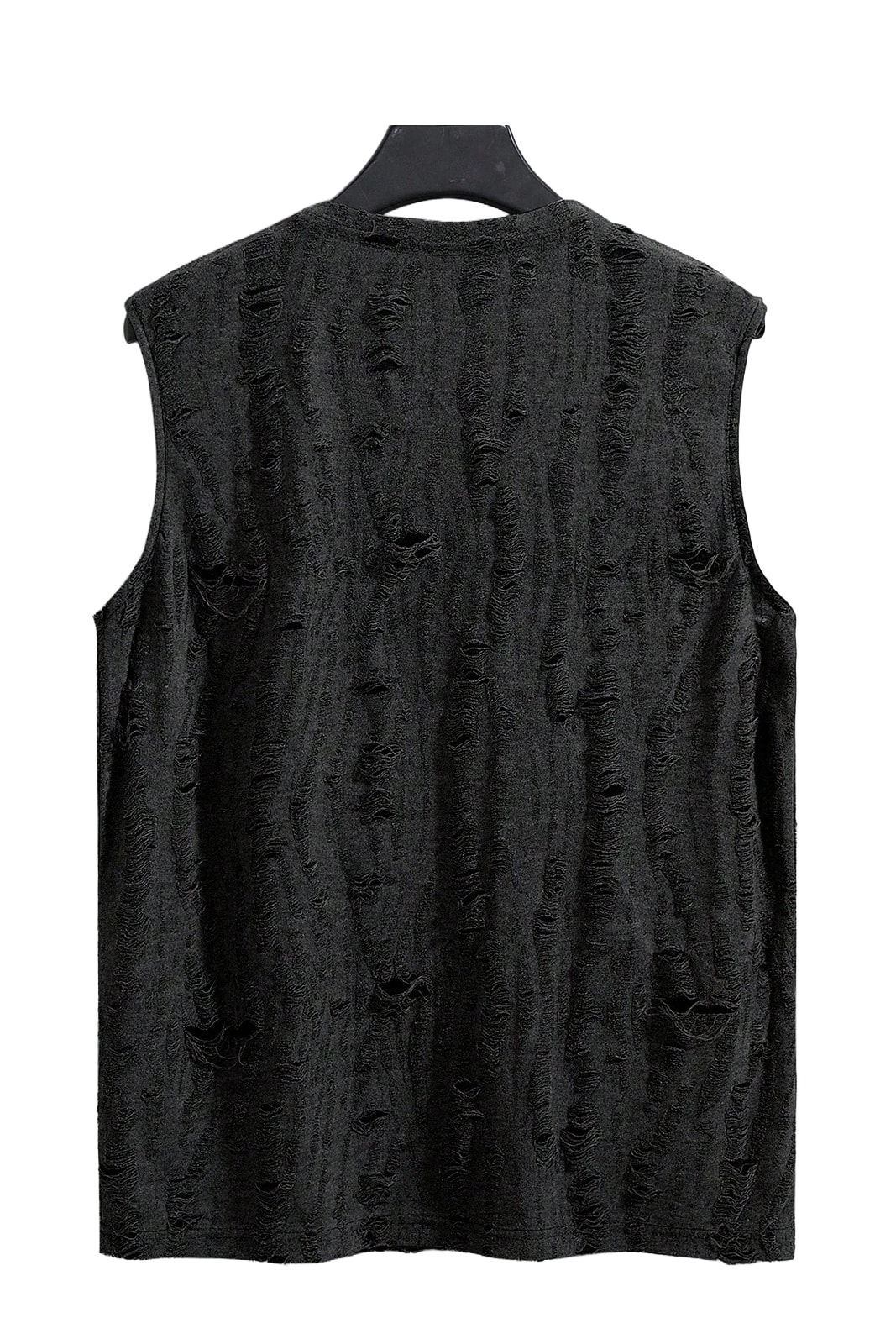 Dieses ärmellose Shirt setzt auf einen bewusst abgenutzten Distressed-Look und transportiert rohe, urbane Darkwear-Ästhetik. Die unregelmäßigen Used-Strukturen und feinen Durchbrüche verleihen dem Stoff Tiefe und Charakter, während der gerade Schnitt für einen lässigen, maskulinen Fall sorgt. Ideal für Layering oder solo getragen – ein starkes Basic mit rebellischem Unterton.